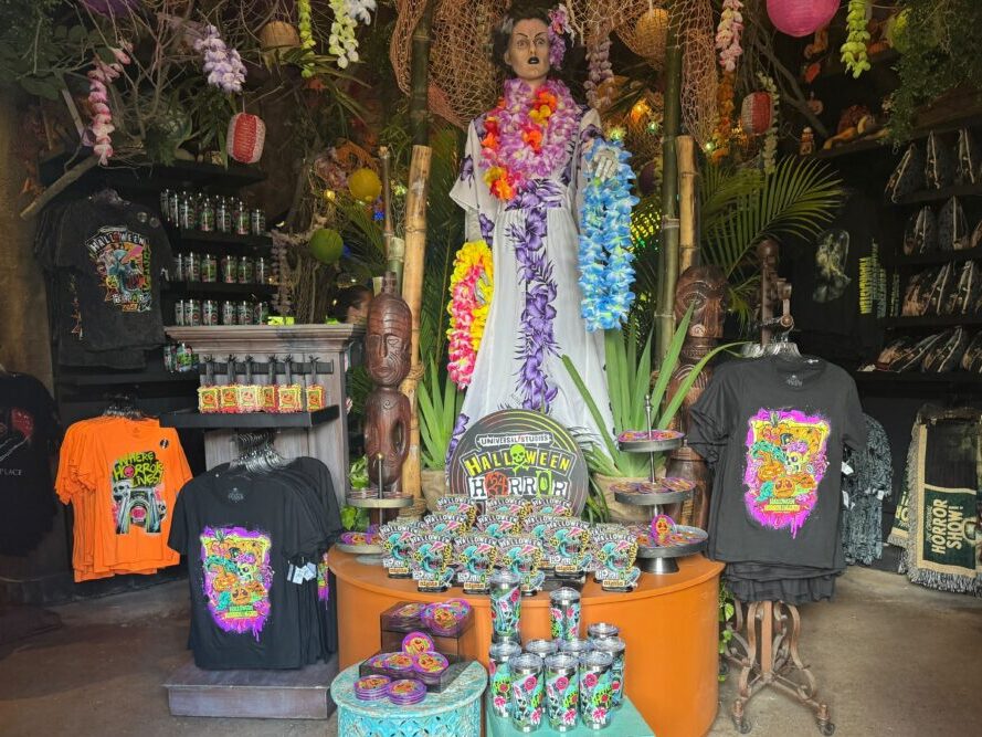 A store display showcases vibrant Halloween-themed t-shirts and assorted merchandise. A mannequin adorned with leis stands at the back, surrounded by colorful decorations and tropical-themed items, reminiscent of Halloween Horror Nights at Universal Orlando Resort.