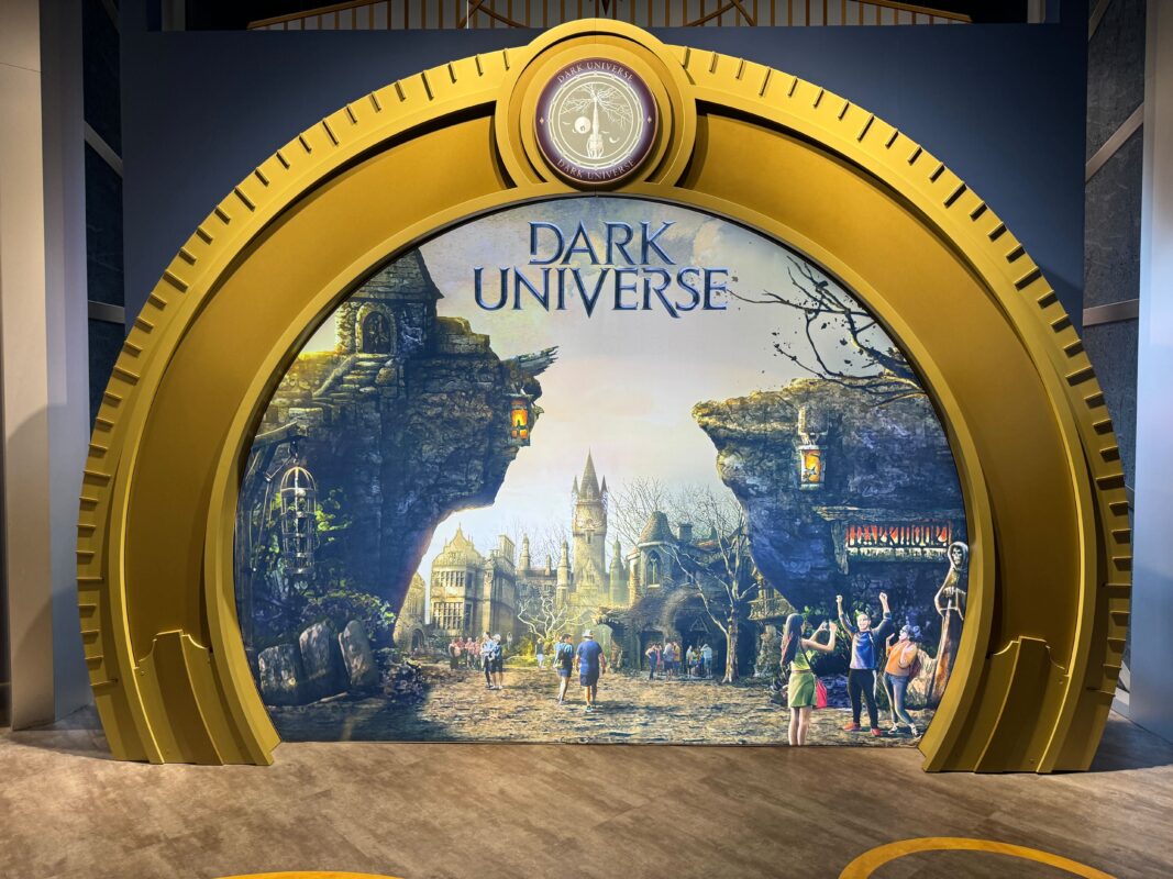 The entrance marquee resembles one of the golden portals that will be in Epic Universe. The portals lead guests to each of the lands: Celestial Park, Dark Universe, The Wizarding World of Harry Potter – Ministry of Magic, How to Train Your Dragon – Isle of Berk, and Super Nintendo World.