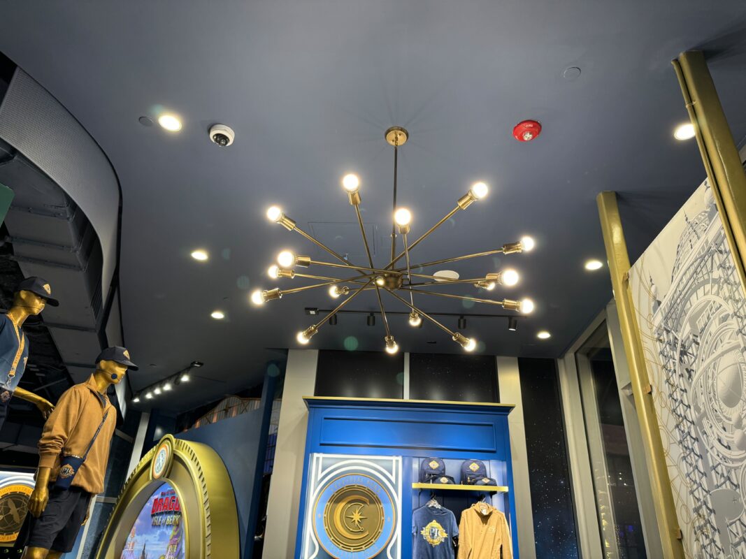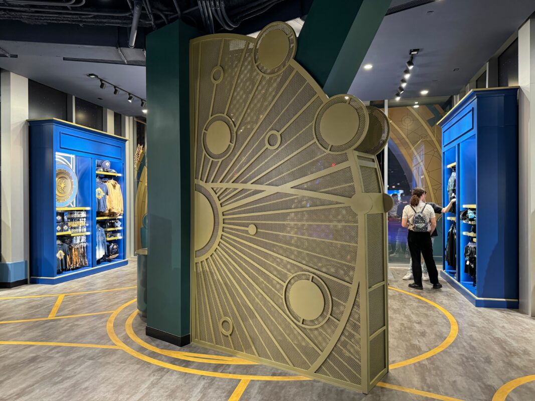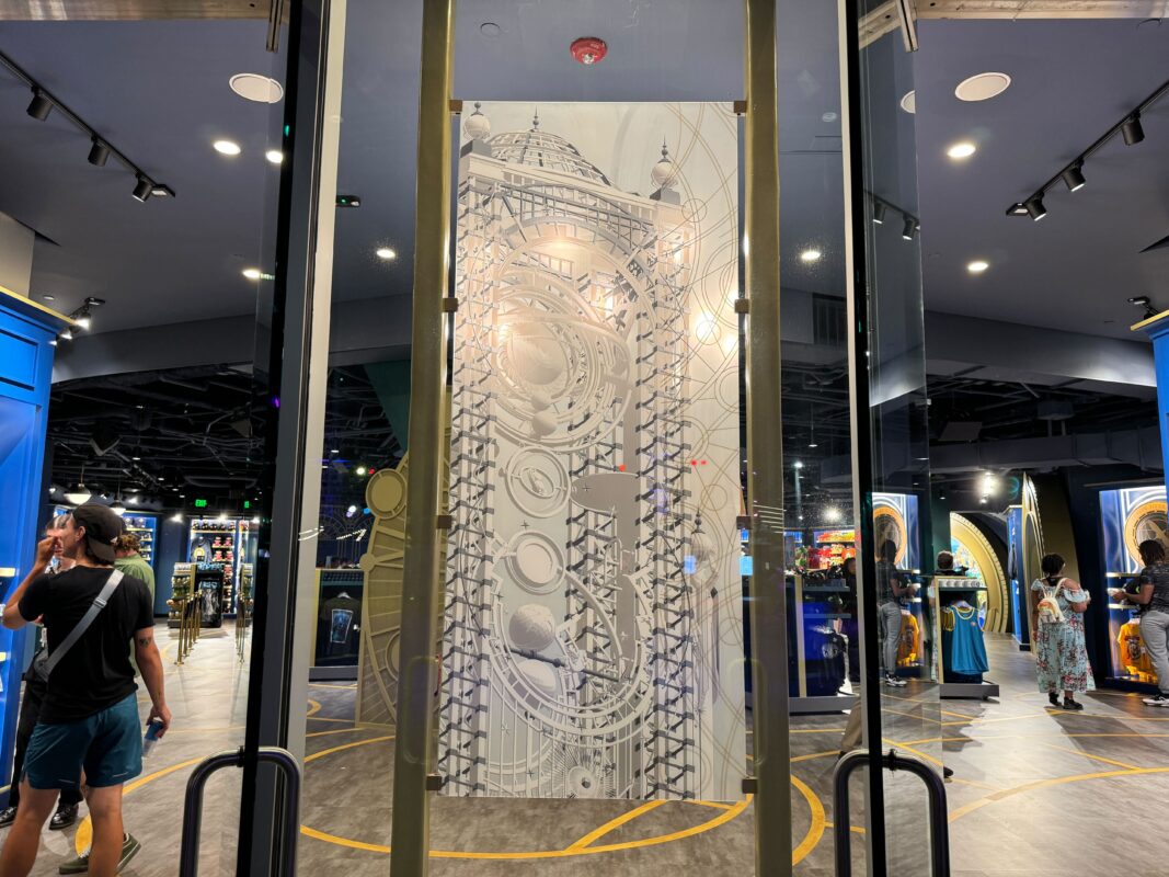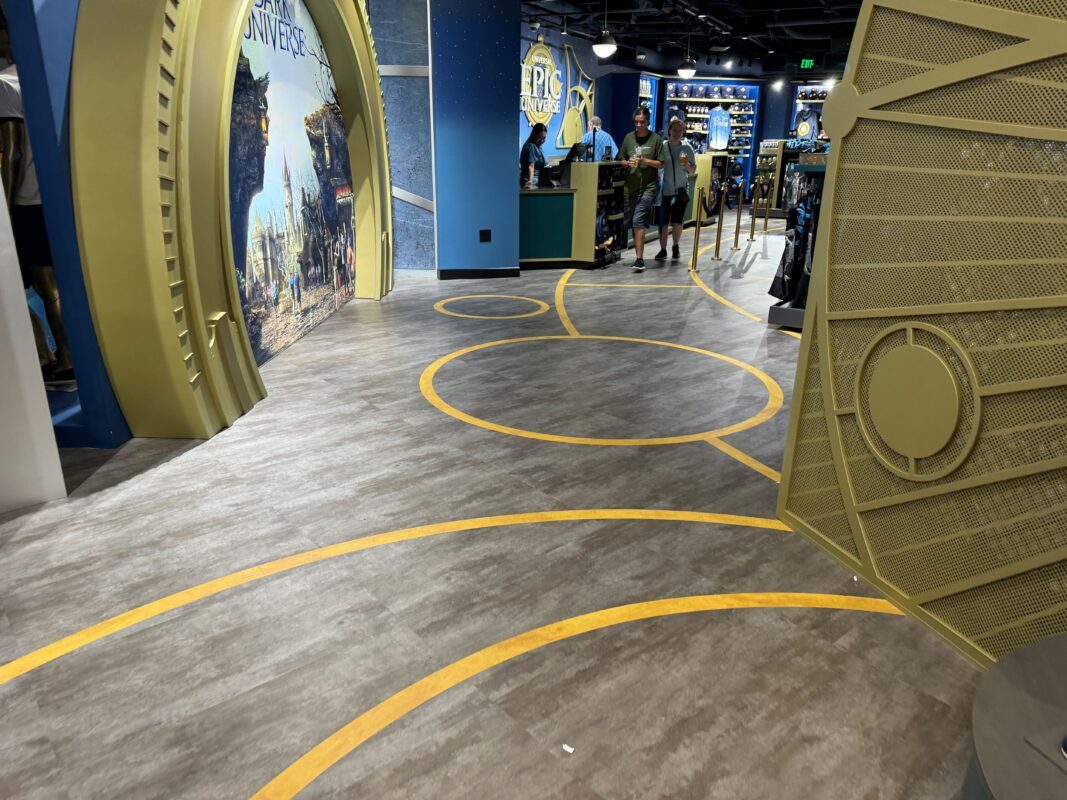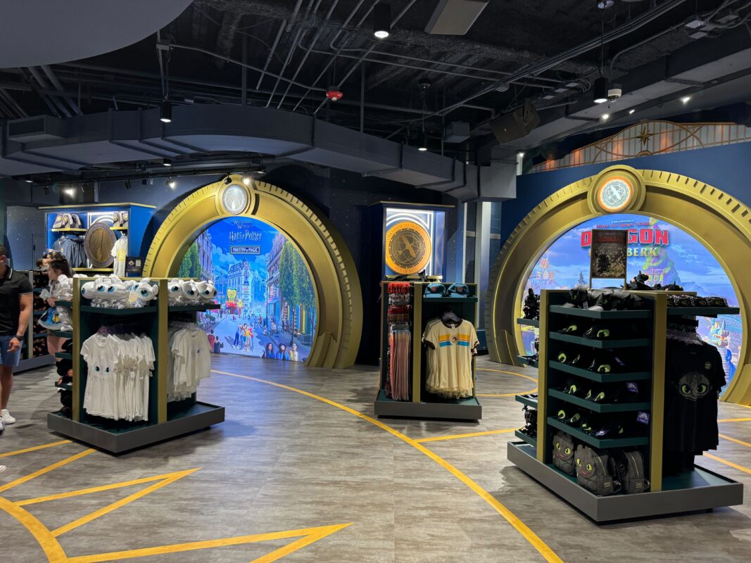 There are merchandise displays across the floor. Four golden archways are on the walls, showing concept art of one of the four IP-based lands beyond.