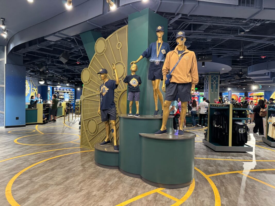 The interior uses more gold and green decorative elements, like these platforms displaying a family of mannequins wearing Epic Universe apparel.