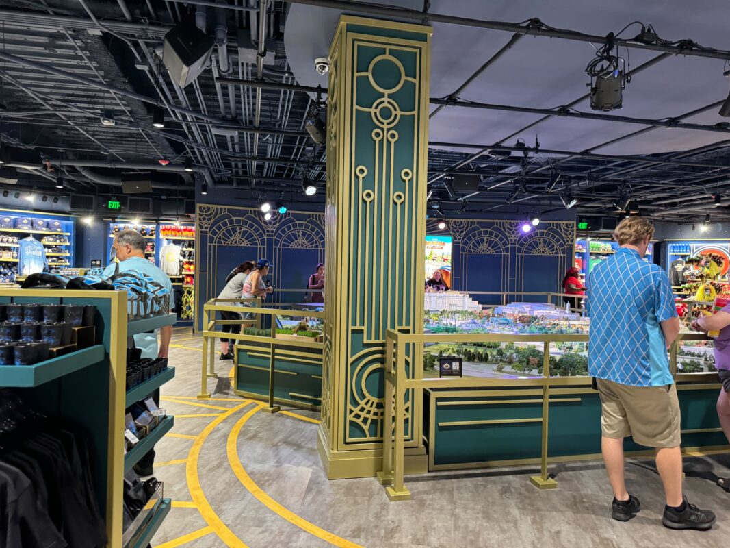 Some of the store’s intricately detailed paneling has an Art Deco style. Gold railings surround the Epic Universe model.