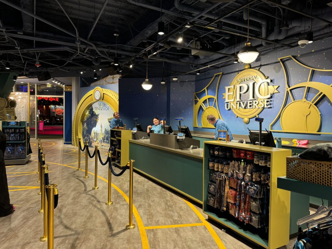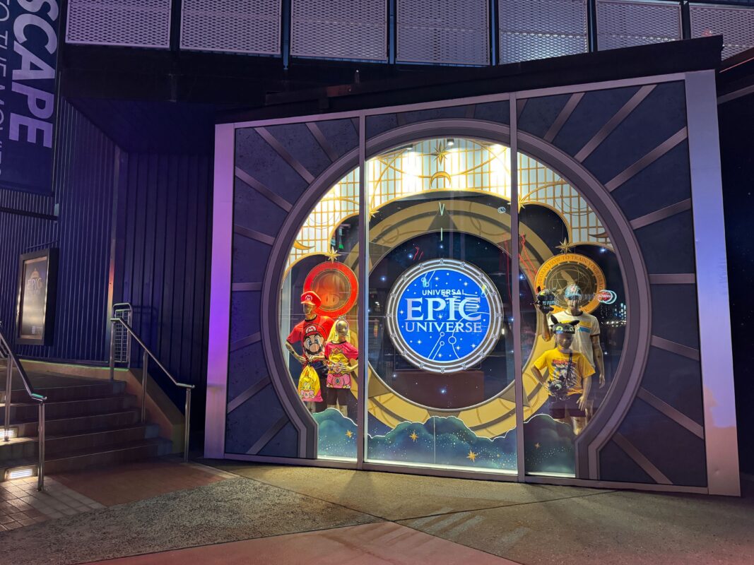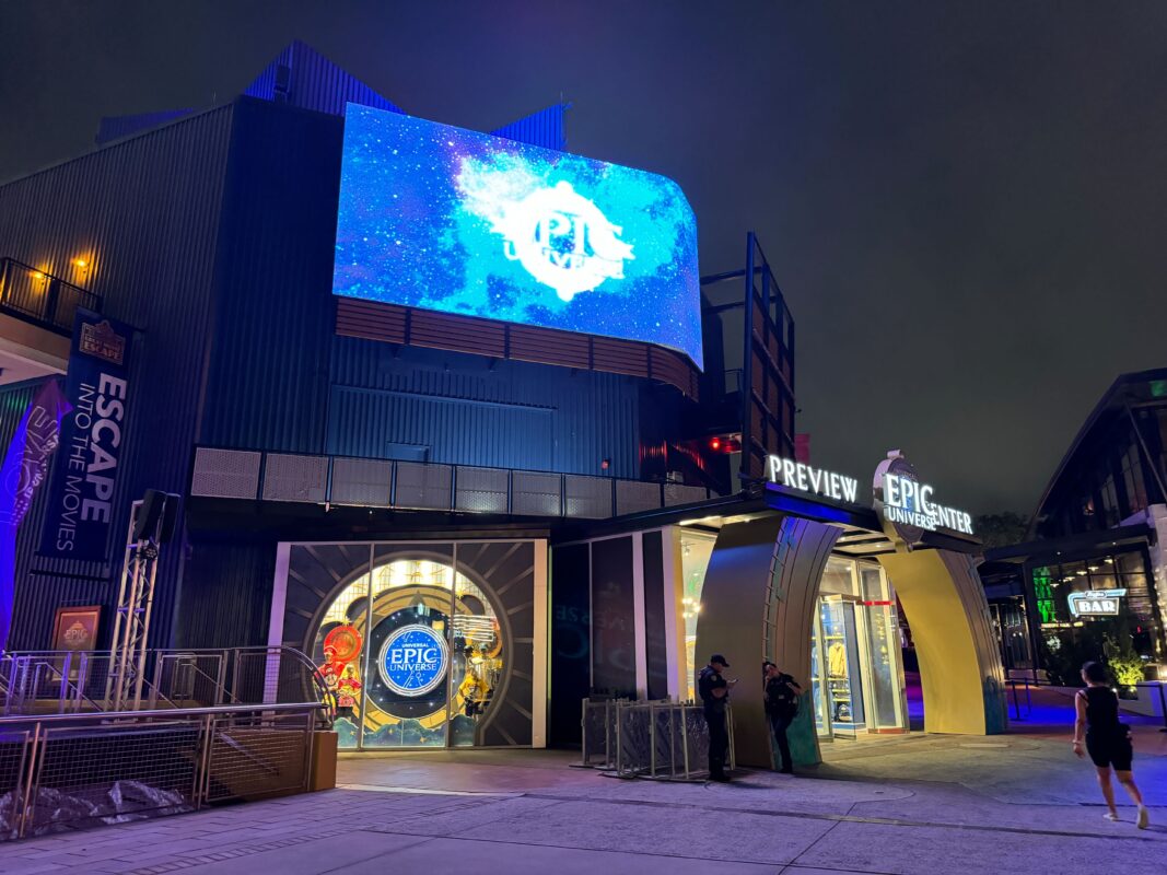 The Preview Center takes over the space formerly occupied by the Universal Legacy Store. A screen mounted on the facade displays the Epic Universe logo and concept art, along with digital flyover videos of the park.