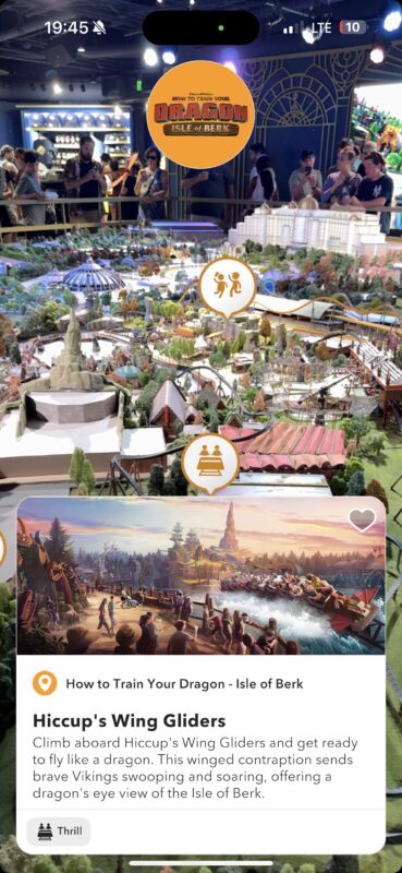 The land’s roller coaster is Hiccup’s Wing Gliders, which the Epic Universe Preview Center app describes as: