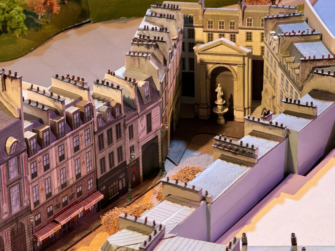 This new concept art for The Wizarding World of Harry Potter – Ministry of Magic features long Parisian streets. The entrance to Le Cirque Arcanus is at the end, next to a building featuring an Eiffel Tower decoration. The medallion features a hand holding a wand.