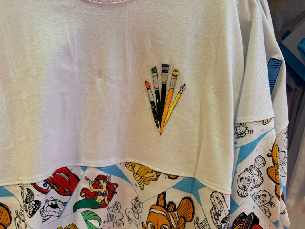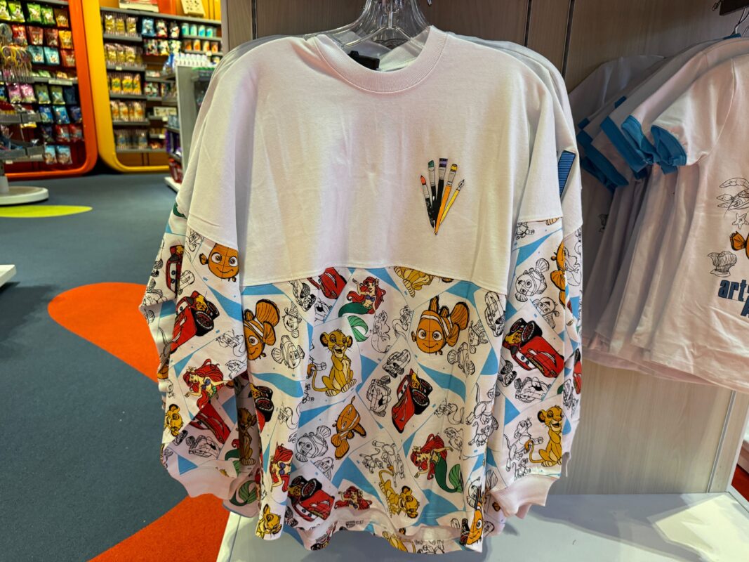 The newest Art of Animation Spirit Jersey is white. The bottom half of the shirt has a pattern of the various character art featured around the resort, as pictured below.