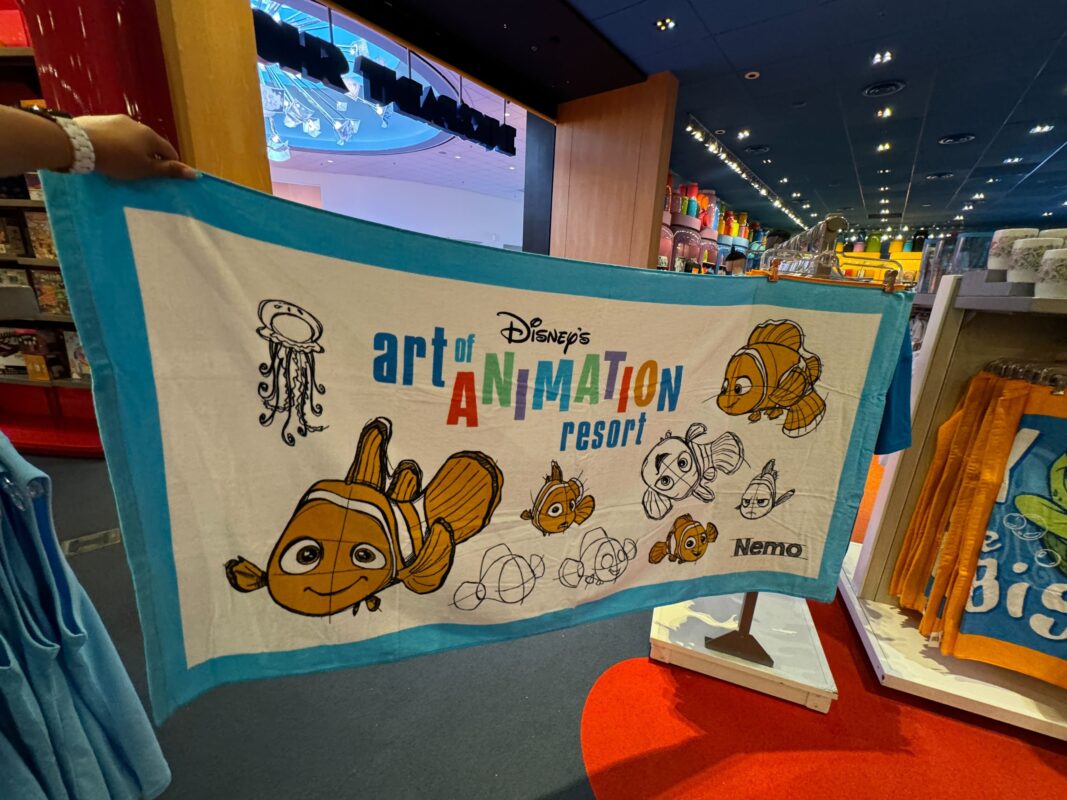 Another item starring Nemo is a new beach towel. It’s white with blue edges. The Disney’s Art of Animation Resort logo sits above various sketches of Nemo in different poses.