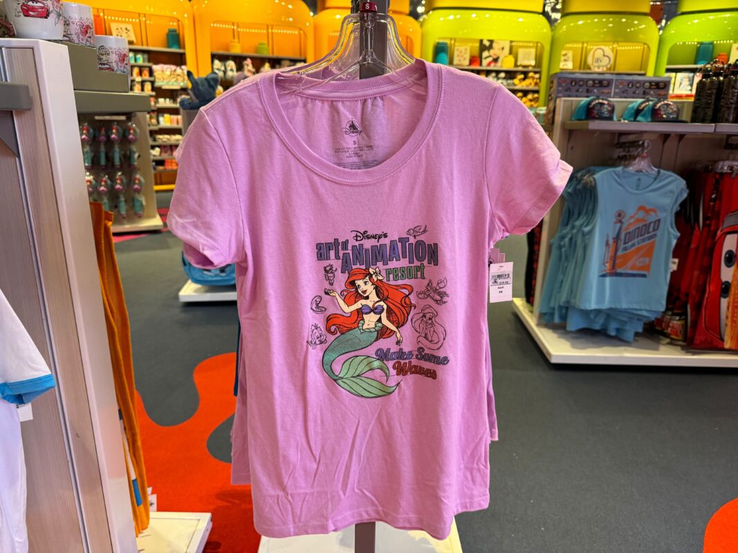 A pink fitted tee highlights Ariel in the center below the resort logo. To her right is “Make Some Waves,” and she is surrounded by black sketch-style drawings of Flounder, Sebastian, and more.