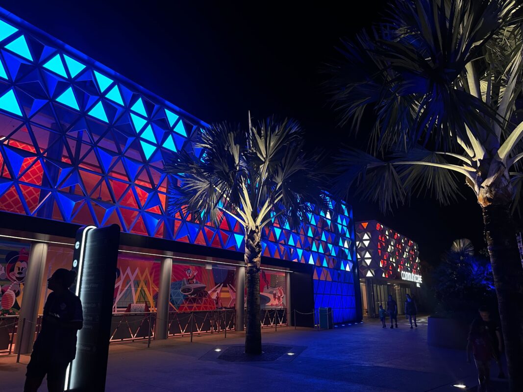 A spherical structure illuminated with blue, white, and red lights at night, partially obscured by trees in the foreground, creates a mesmerizing scene reminiscent of an EPCOT Fourth of July fireworks display.