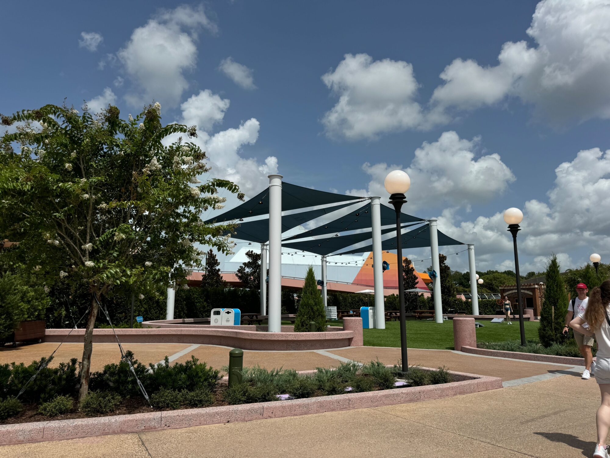 The newest addition to this flex space features an outdoor seating area with a modern canopy structure, surrounded by greenery and lampposts. The area resembles a park or public gathering space with a blue sky and scattered clouds in the background, reminiscent of EPCOT's open design.