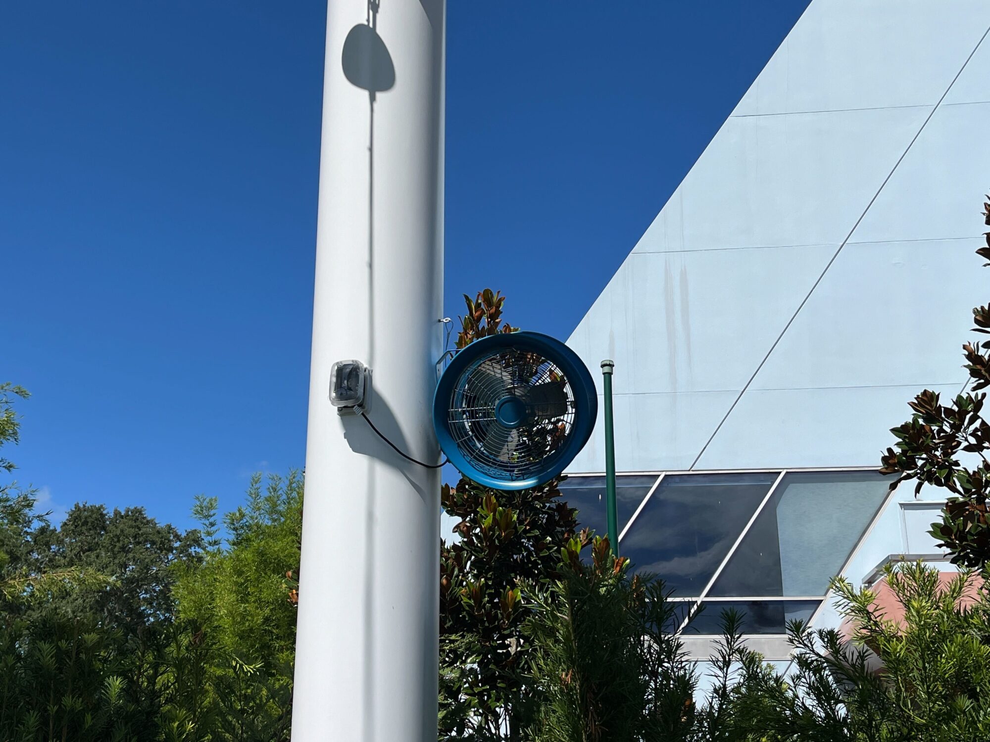 A blue industrial fan is mounted on a white pole next to a building with triangular windows and angular design, reminiscent of EPCOT's architectural style. There is greenery in the foreground and a clear blue sky in the background.