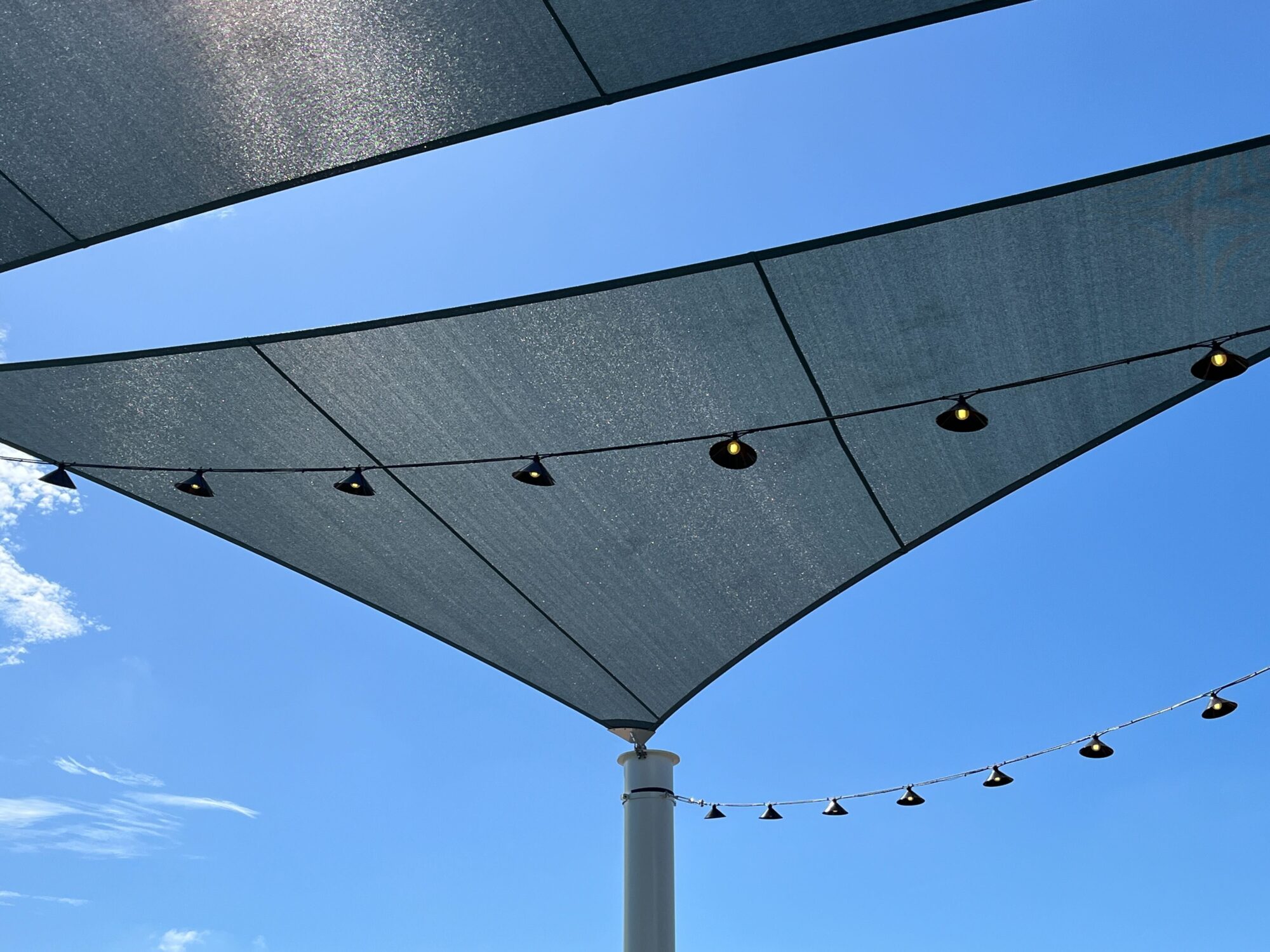 A triangular fabric canopy with string lights, the newest addition to our flex space, is attached to a white pole, set against a clear blue sky.