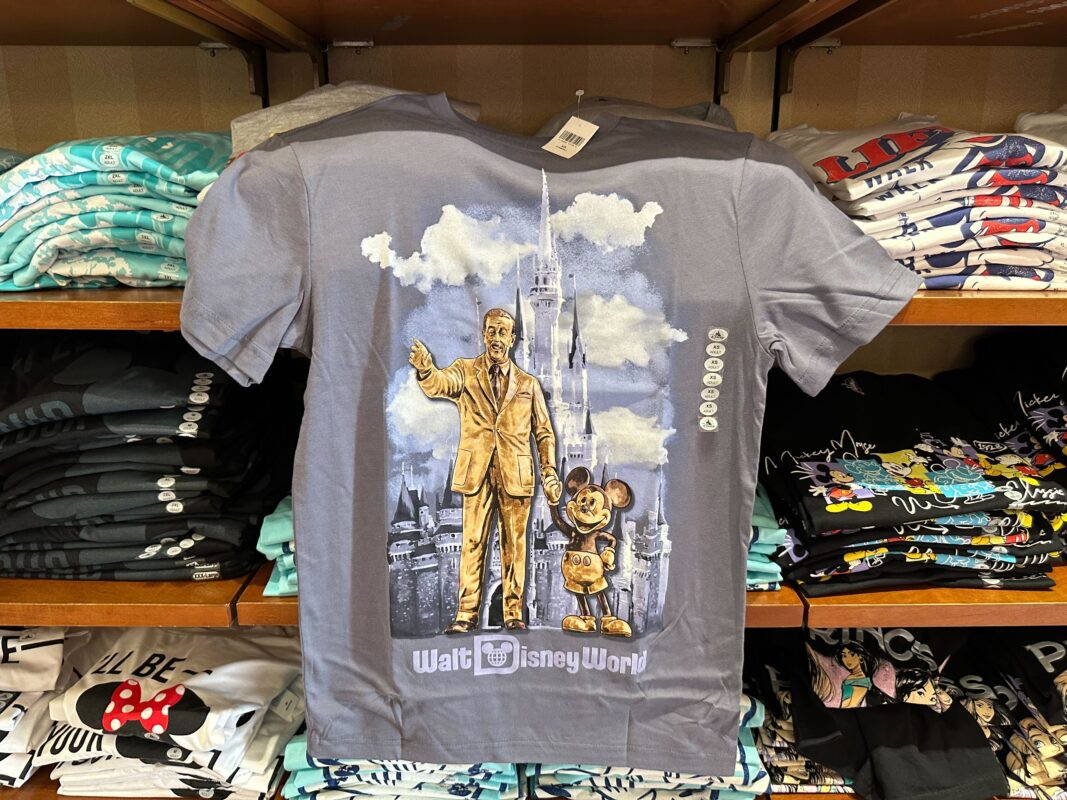 This dark grey T-shirt features a graphic of the iconic statue with Cinderella Castle in the background amidst several fluffy white clouds. The Walt Disney World Resort wordmark sits beneath the statue. The shirt is eligible for the “2 for $24.99 each” promotion, along with other select shirts in the Emporium. By itself, it’s priced at $29.99