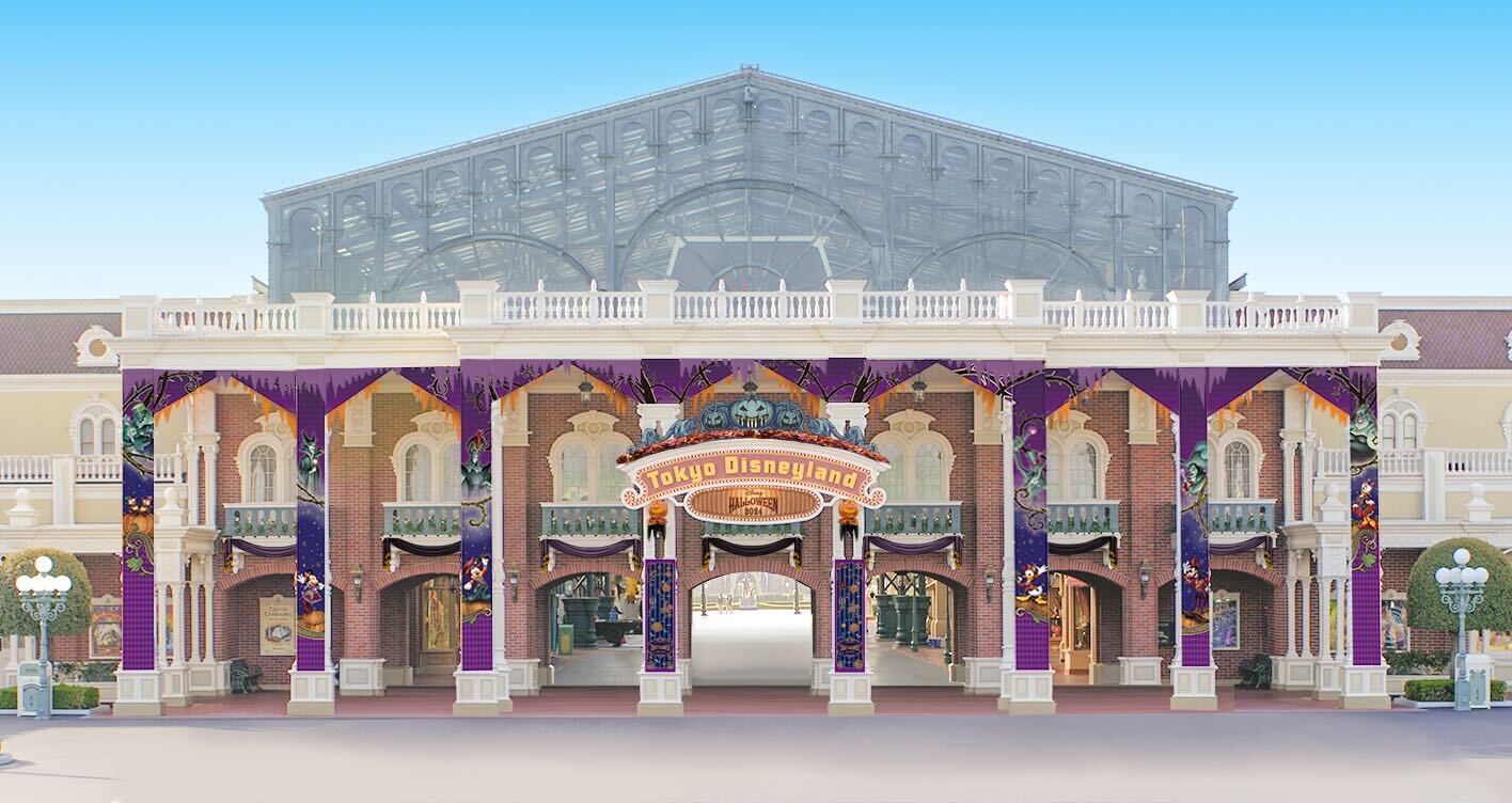 Halloween decorations will once again be set up throughout both Tokyo Disneyland and Tokyo DisneySea. Above is concept art for the banners and the themed sign that will hang at the entrance to Tokyo Disneyland.