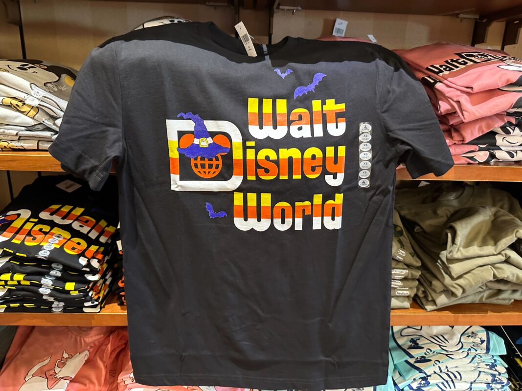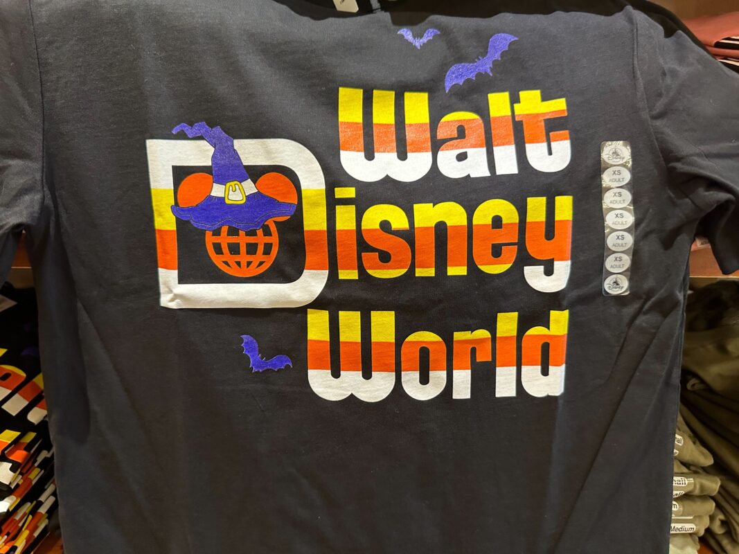 We found this generic Walt Disney World Halloween tee in the Emporium at Magic Kingdom. It’s black with the retro-style Walt Disney World wordmark in the center. The letters are striped yellow, orange, and white like candy corn.