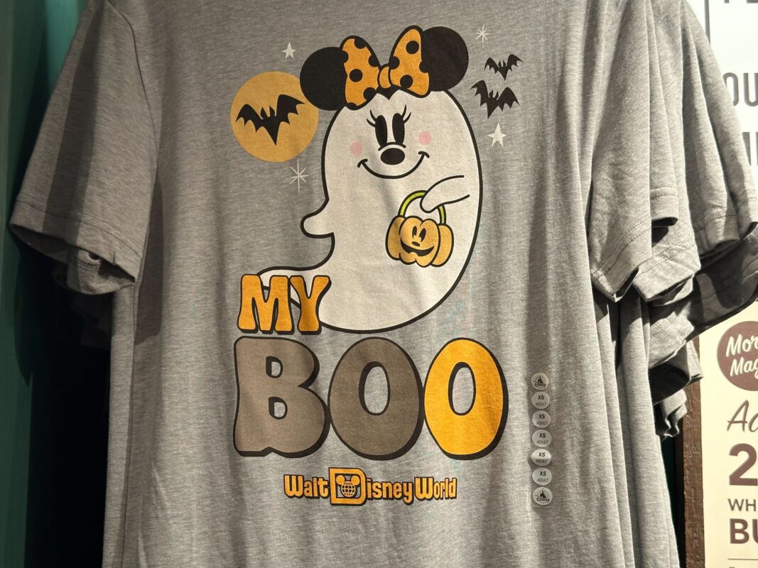 Both of these tees are heather gray with “My Boo” in rounded orange letters. This version features a Minnie-inspired ghost with mouse ears and an orange polka-dotted bow. She carries a Jack-o’-Lantern bucket.