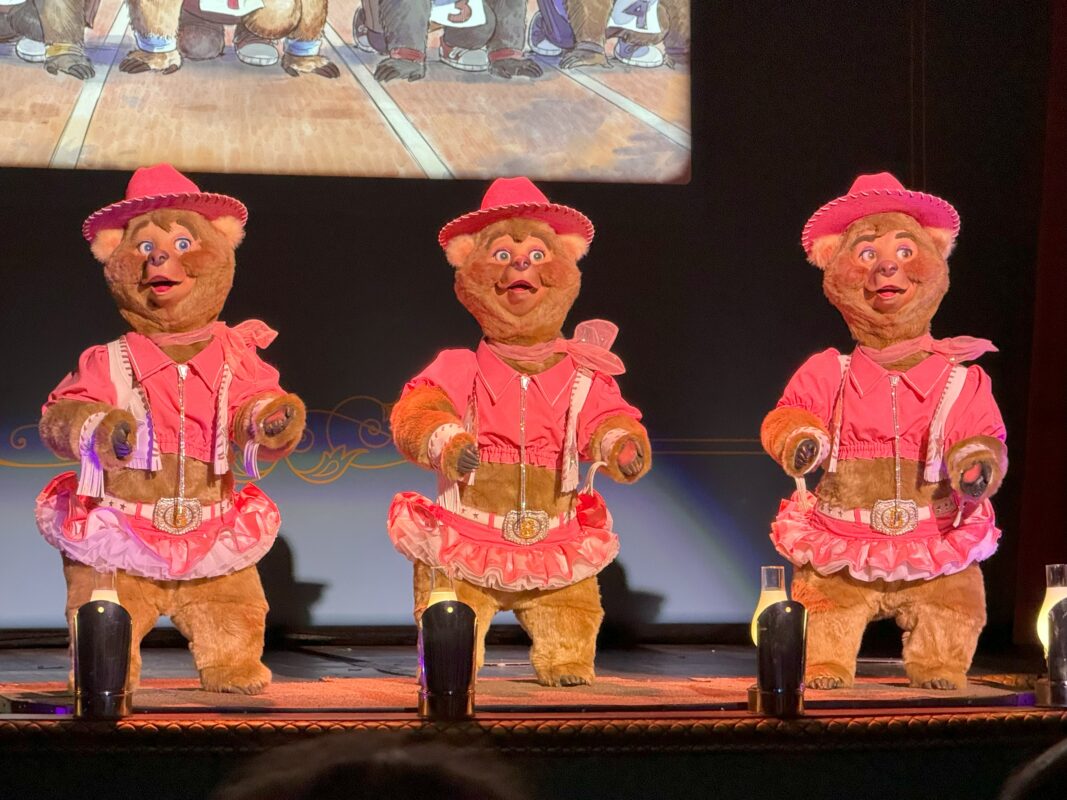 The Five Bear rugs all sport matching blue bandanas as they play the first song of the show, “Country Bear Musical Jamboree.”