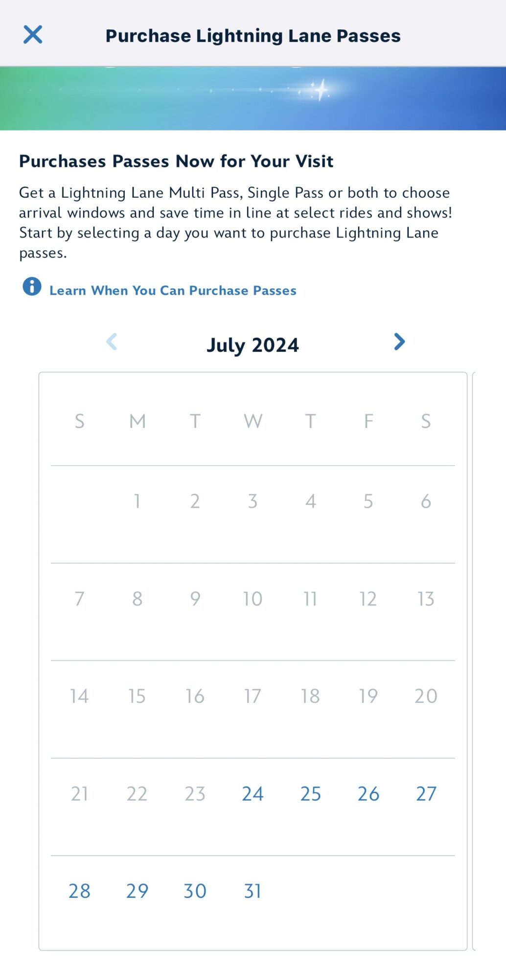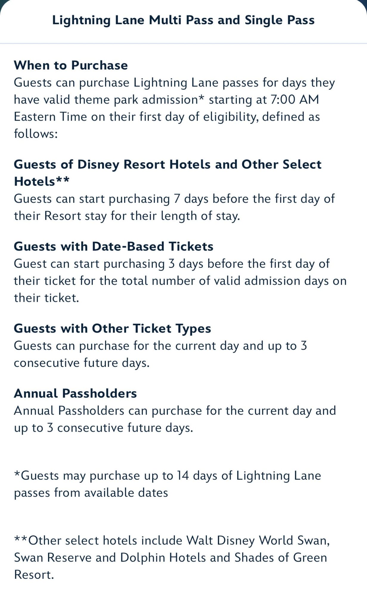 Guests may purchase up to 14 days of Lightning Lane passes from available dates. Sales open at 7 a.m. ET each day.