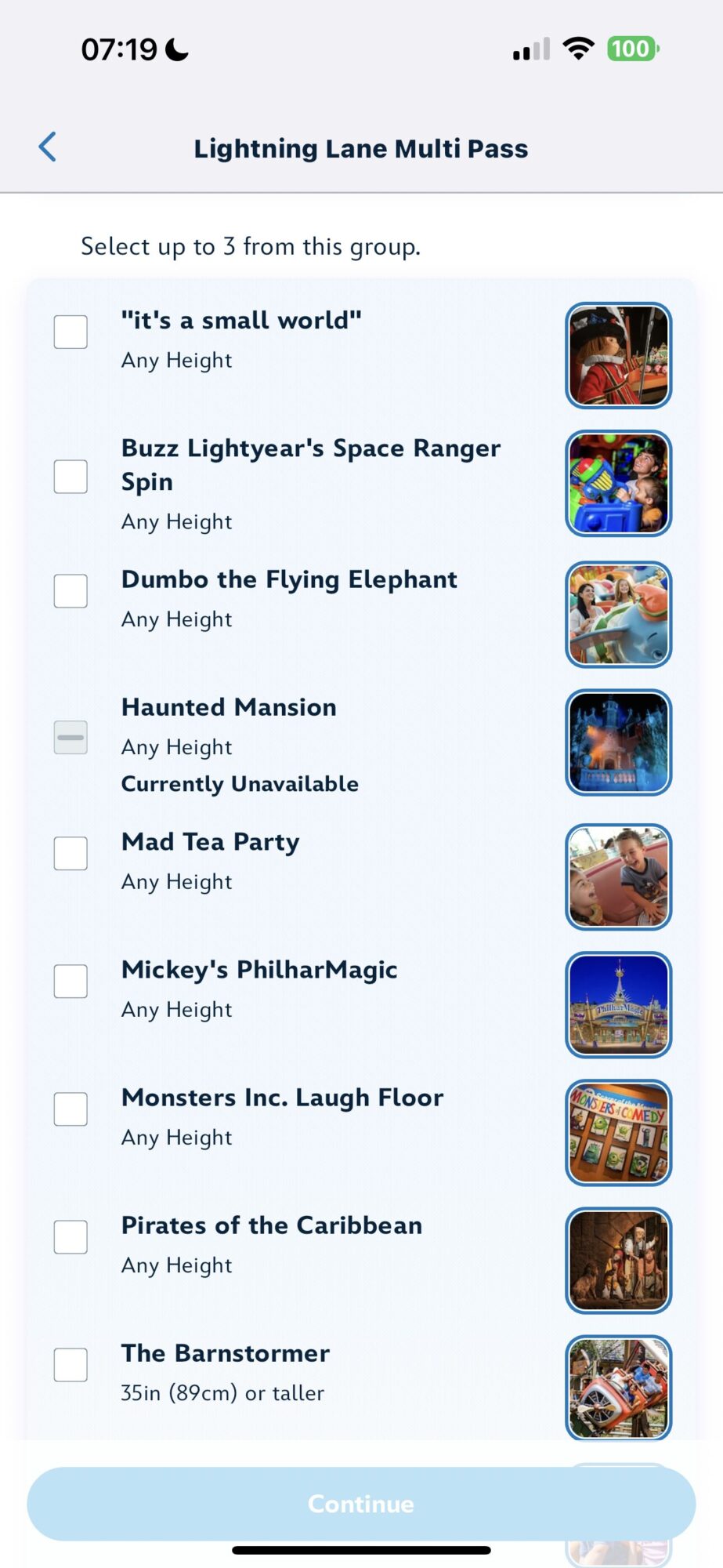 If you choose a Multi Pass, the next page will show you all the available attractions. You can only select up to three attractions in advance. There is the opportunity to make more once you’re in the park.