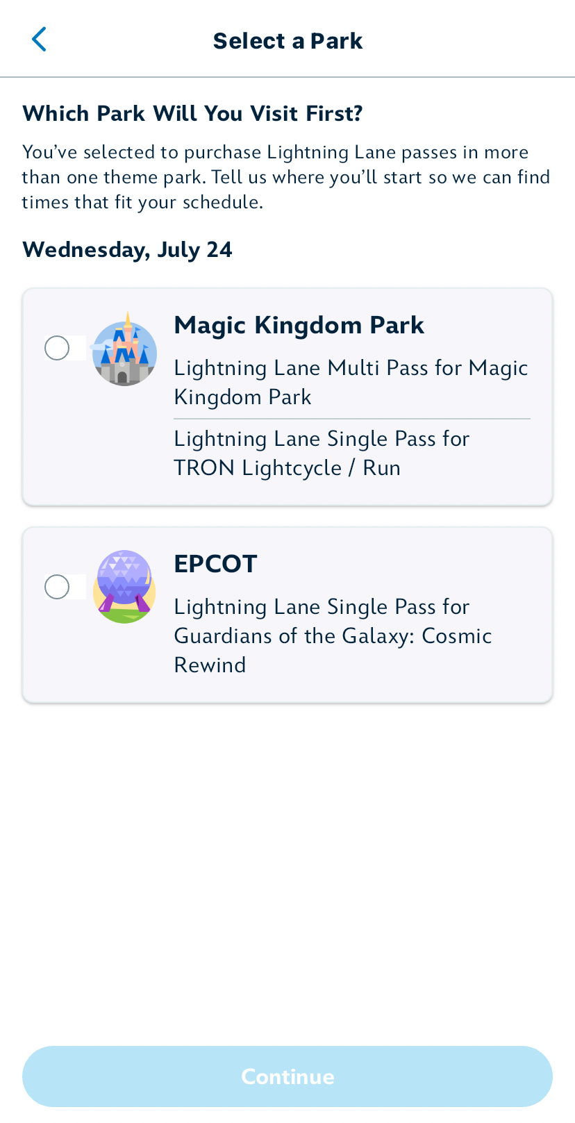 After completing your selections, you will actually purchase your Lightning Lane passes.