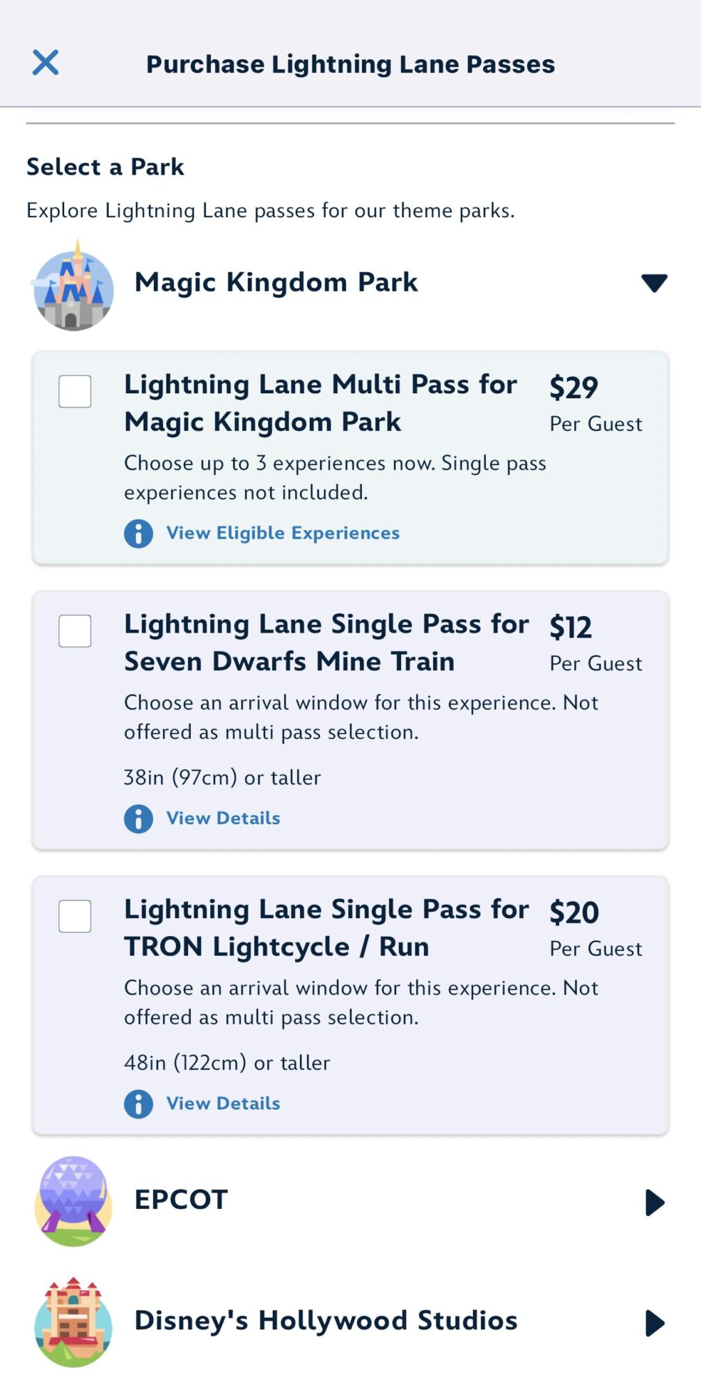 You can then view Lightning Lane pass options for each Walt Disney World theme park. This page will show the Multi Pass pricing and the Single Pass pricing. You can select up to one Multi Pass and two Single Passes in one transaction. Note that a multi-park option is not available in advance. However, you can select a Multi Pass for one park and a Single Pass for another park.