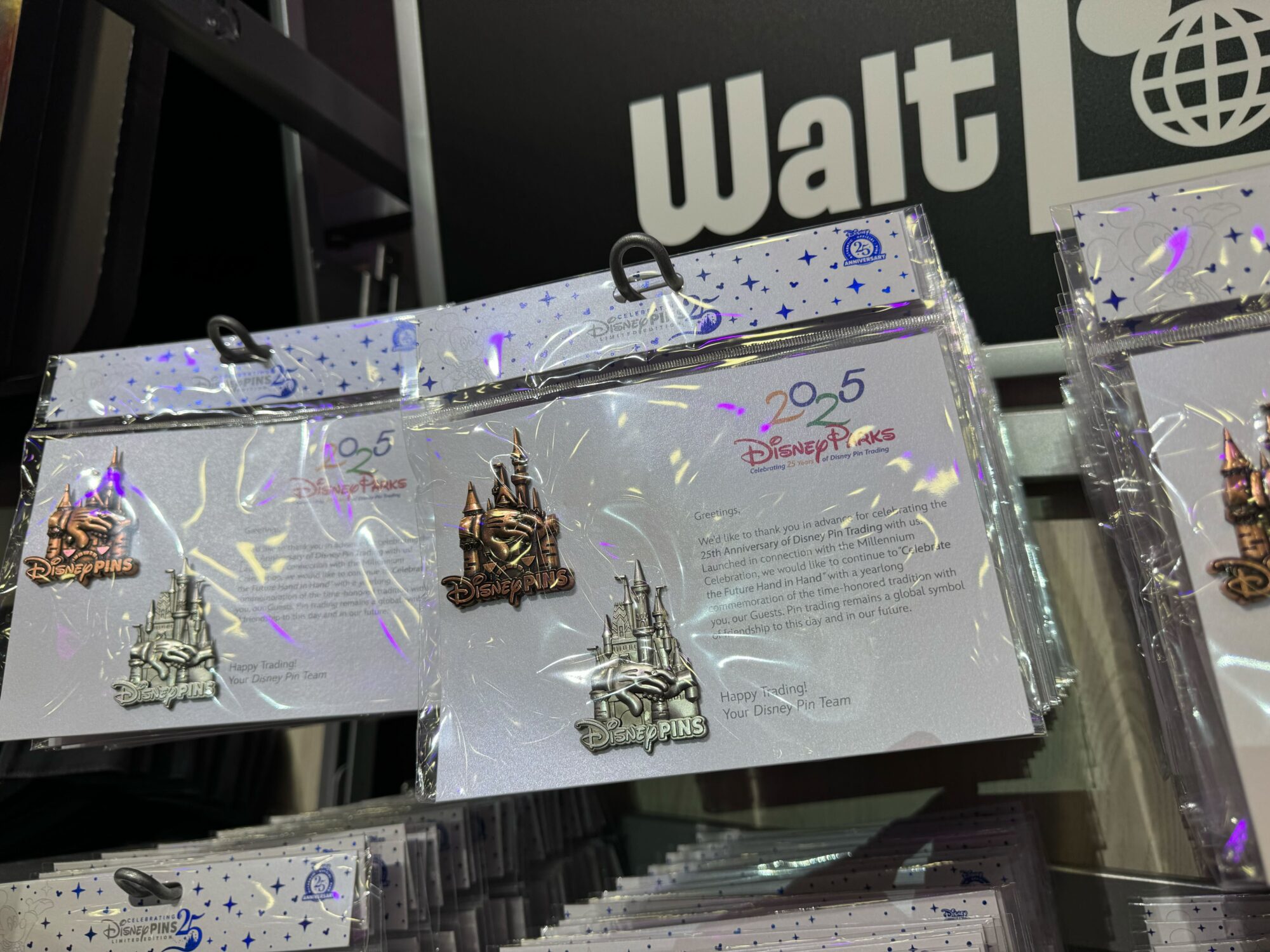 This set features two of the same pin, each with a different color. One brown and one silver. The design is of Mickey Mouse’s hand grasping a human hand in front of Cinderella castle, with “DisneyPins” written at the bottom. A throwback logo to the Walt Disney World Millennium celebration is on the packaging, along with a note thanking guests in advance for celebrating pin trading’s 25th anniversary in 2025.