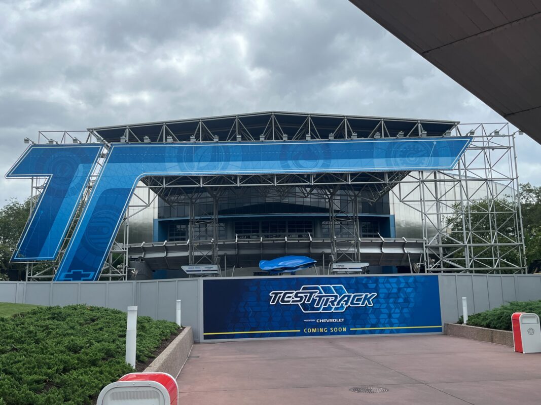For comparison, above is a photo from when Test Track first closed in June. The blue decorations on the front of the awning resembled two “T”s for “Test Track,” with symbols from the attraction incorporated into the blue designs. The Chevrolet logo was at the bottom of one of the decorations.