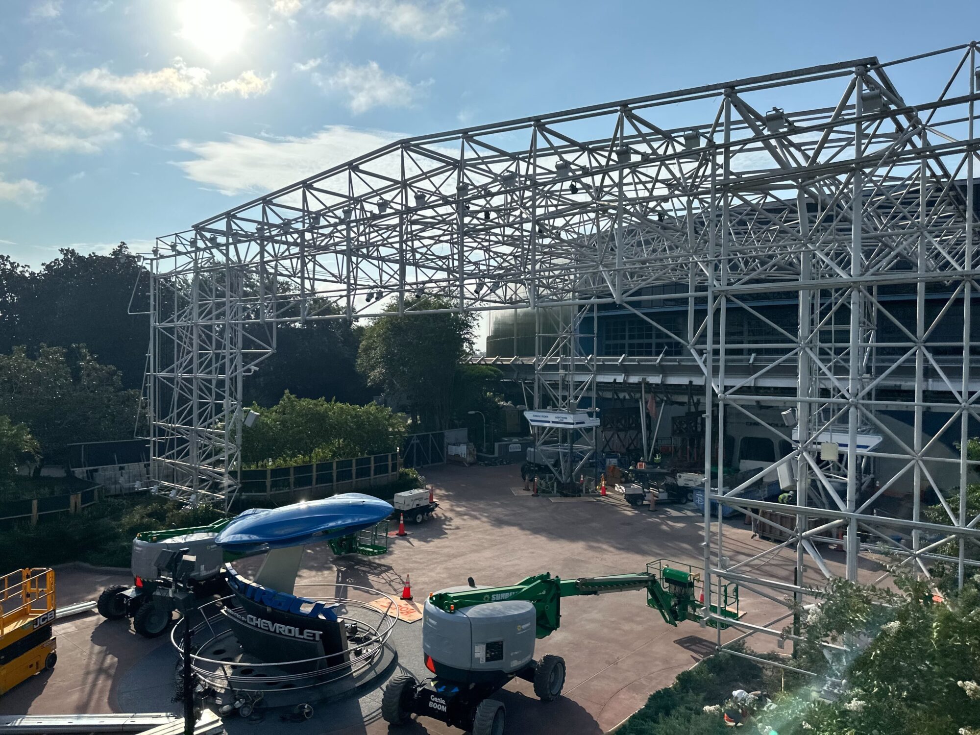 Crews have removed the canopy fabric from the Test Track awning structure at EPCOT. The attraction is currently closed for a major reimagining.