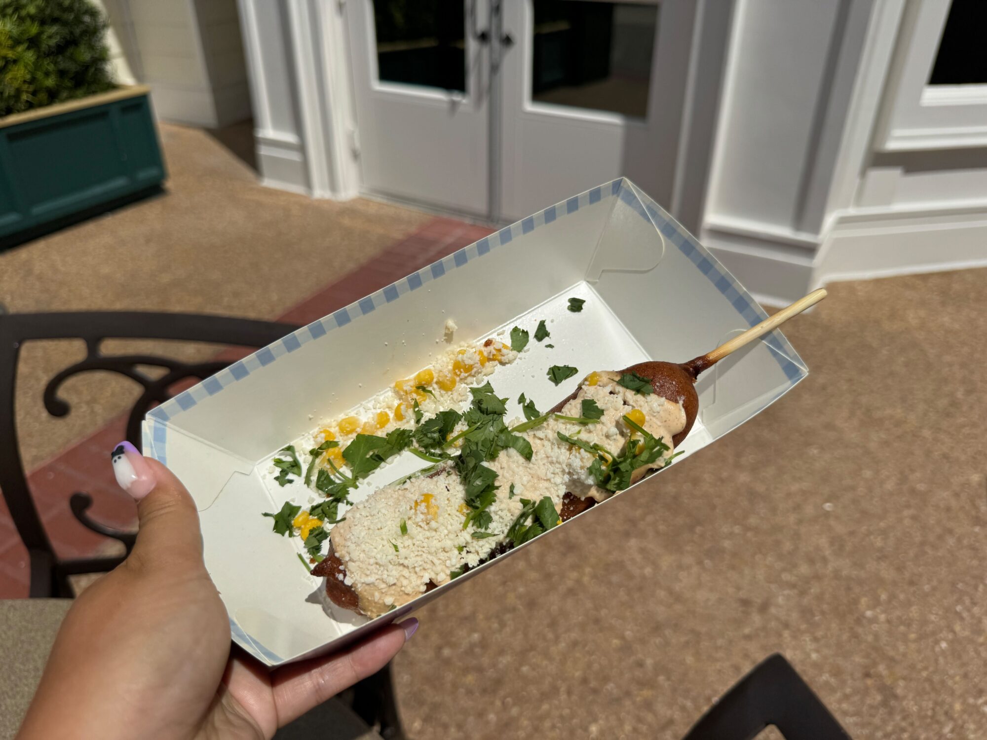 Jalapeño cheddar sausage, fried in cornmeal batter, topped with garlic mayo, corn kernels, cotija cheese, and cilantro. Garnished with a lime wedge and served with a bag of chips.