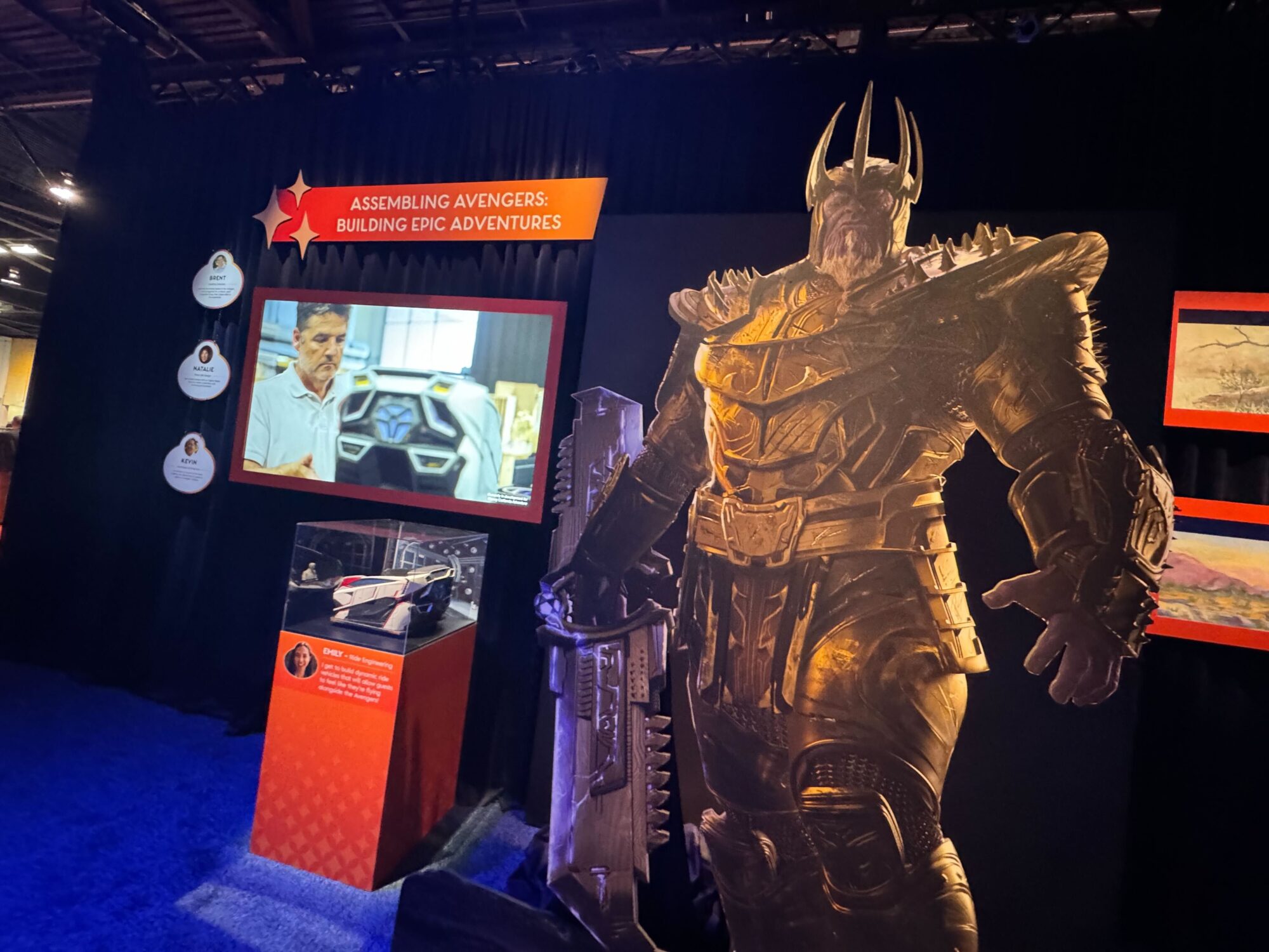 A cardboard cutout of a character in armor stands next to an exhibit with a screen showing a man and vehicle models. The display, titled "Assembling Avengers: Building Epic Adventures," is part of the Disney California Adventure's Multiverse Attraction featuring highlights from Avengers King Thanos.