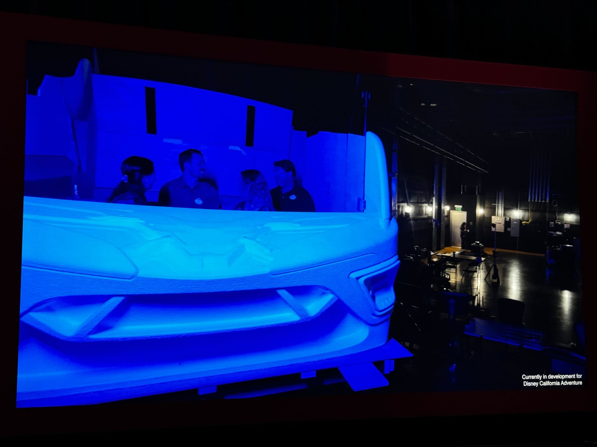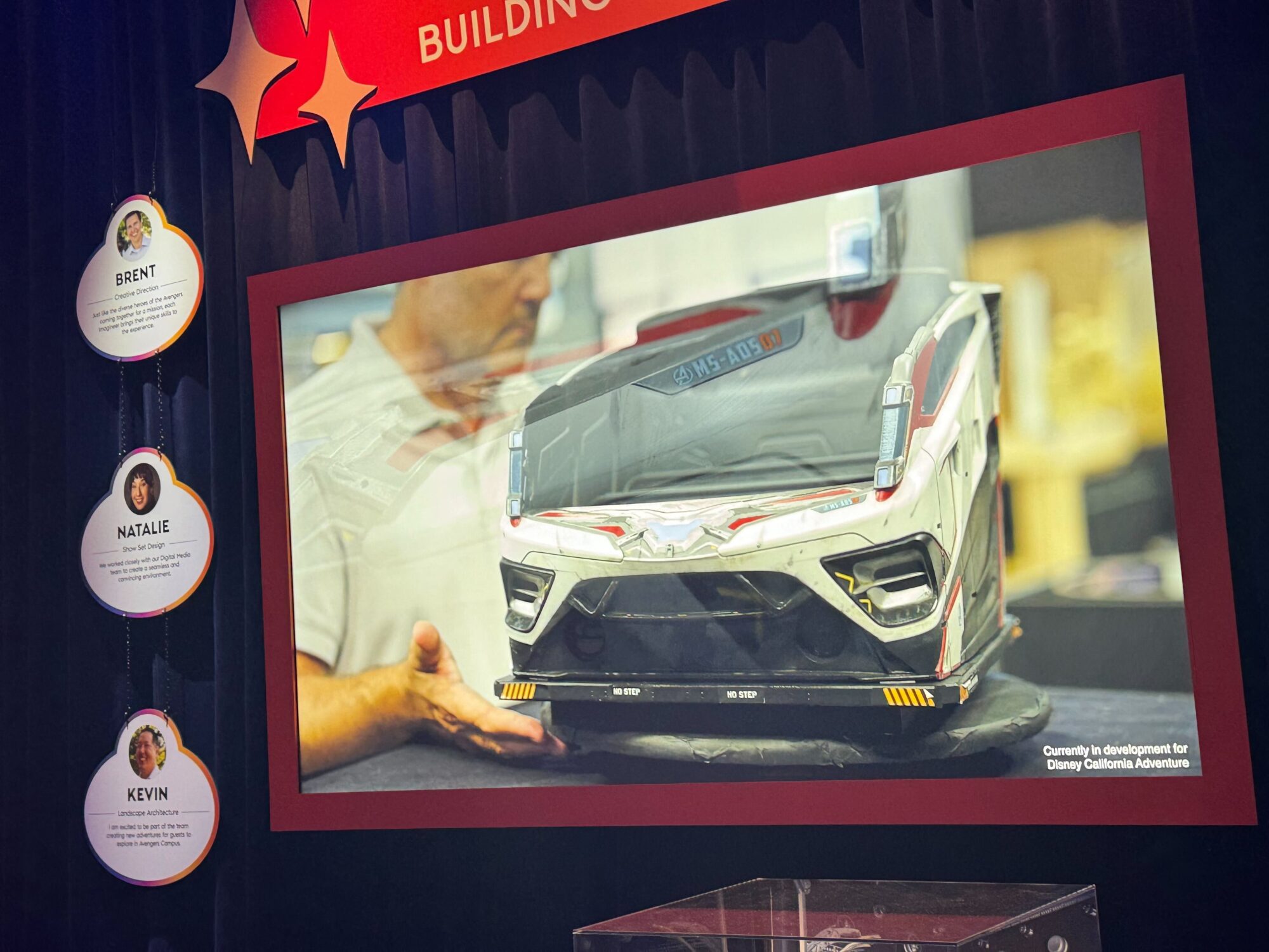 A detailed model of a futuristic vehicle displayed on a screen at the Multiverse Attraction. The caption mentions it is being developed for Disney California Adventure. Photos of three people are shown on the left.