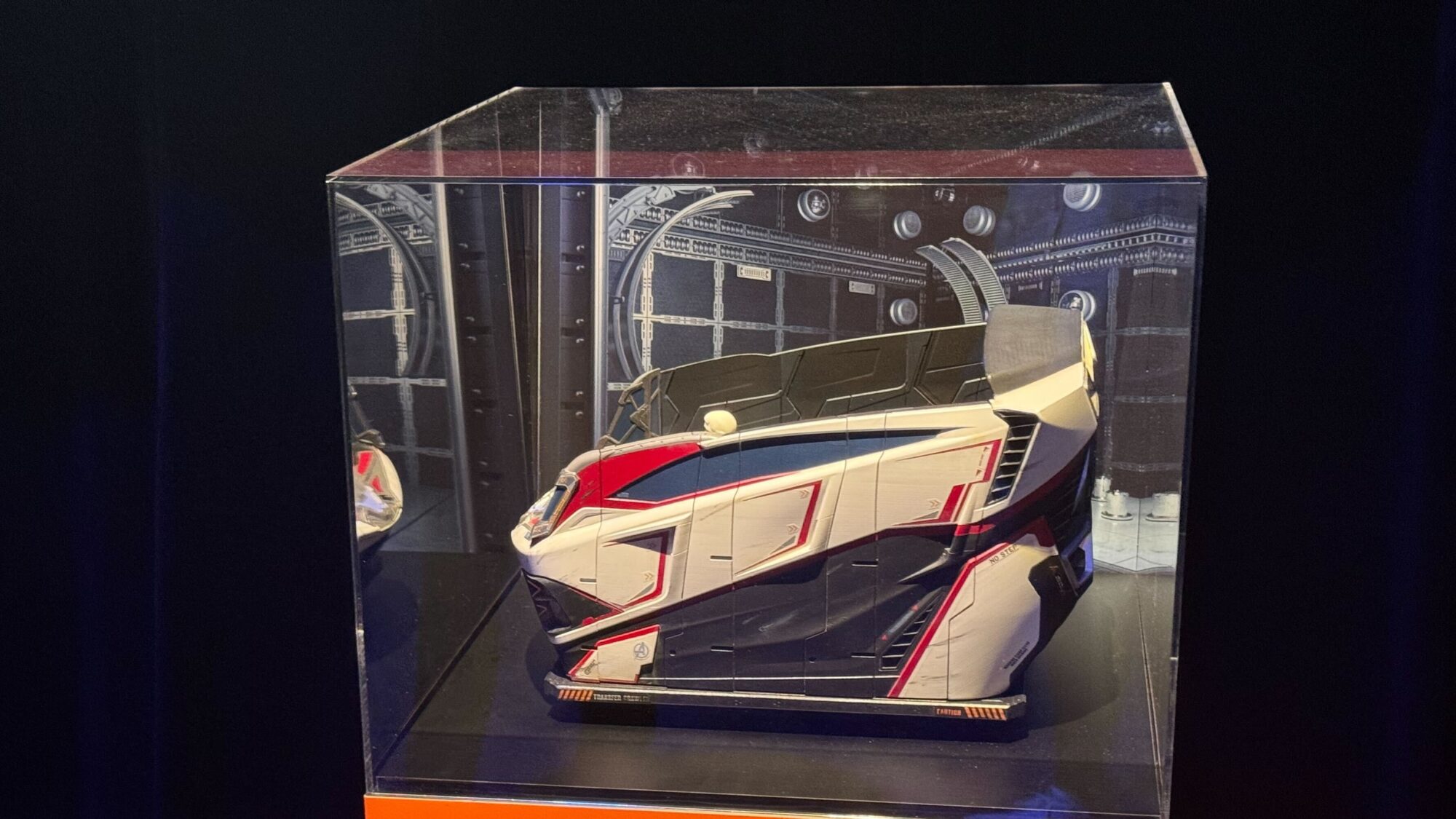 A futuristic, white and black sci-fi prop with red accents is displayed in a transparent case, set against a dark backdrop featuring industrial-themed decorations from the Avengers King Thanos Attraction at Disney California Adventure.