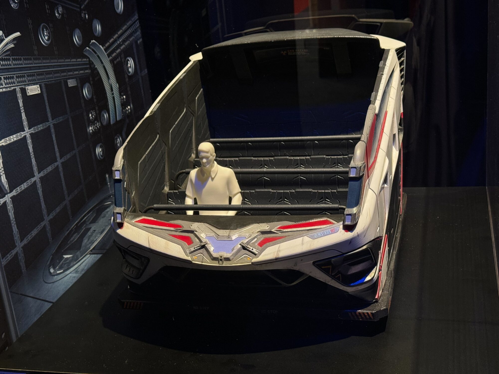 Model of a futuristic vehicle displayed in a glass case at an exhibit. The vehicle features a sleek design with curved edges and a passenger seat occupied by a small, white figurine, reminiscent of the thrilling adventures found in Disney California Adventure's Multiverse Attraction.
