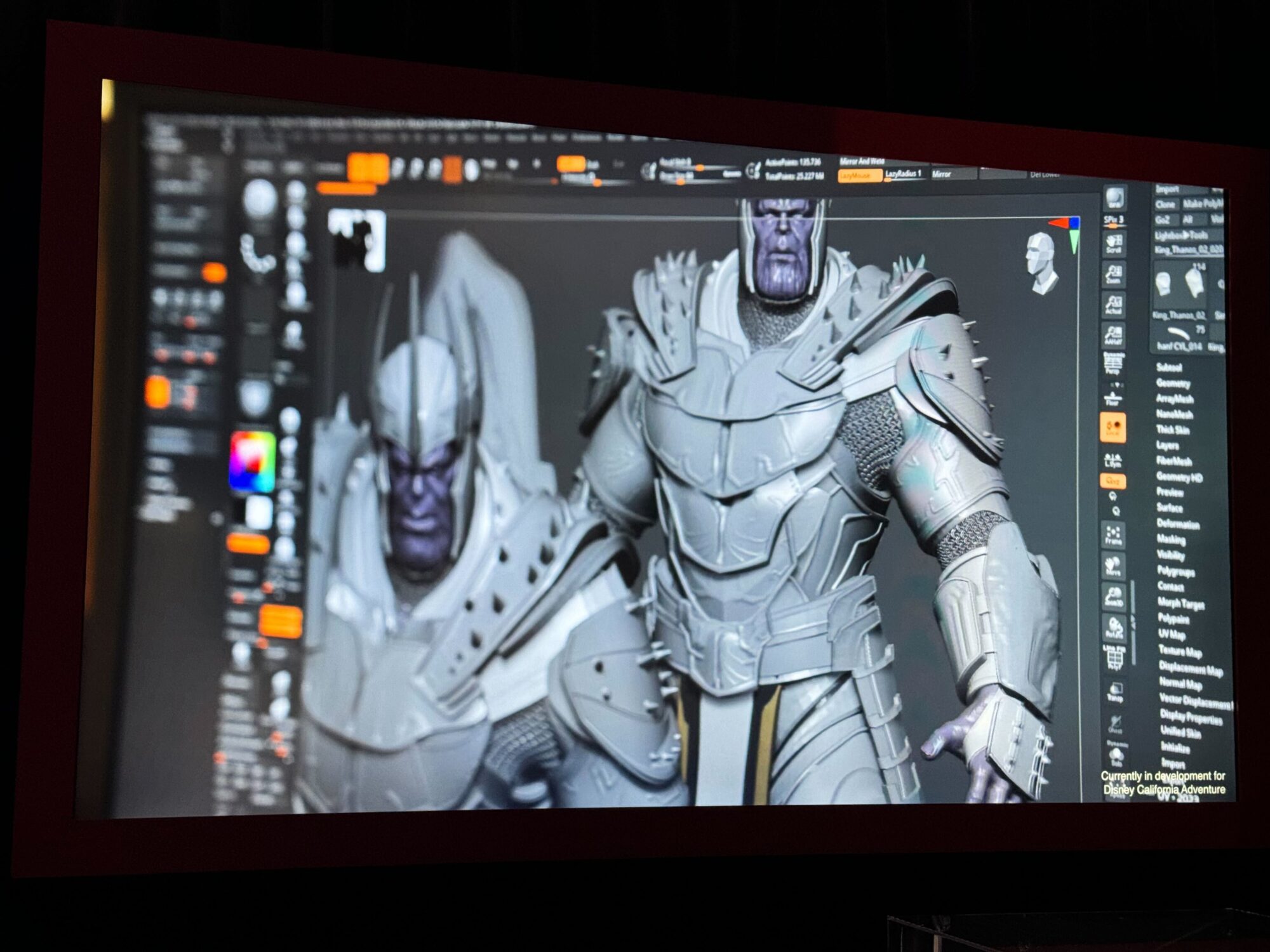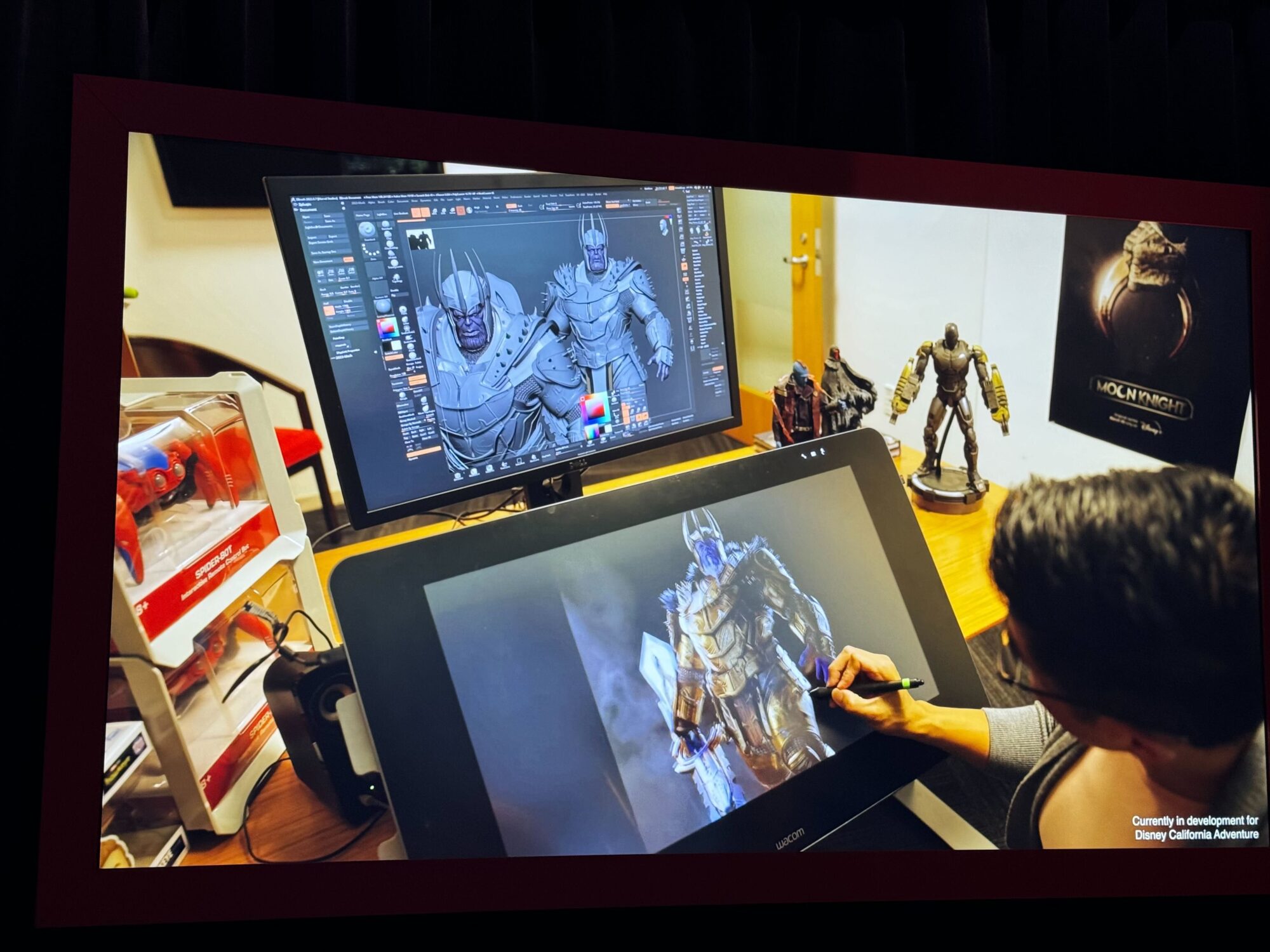 A screen plays a video about the King Thanos and ride vehicle designs. It includes an artist drawing the King Thanos artwork used for the nearby standee.