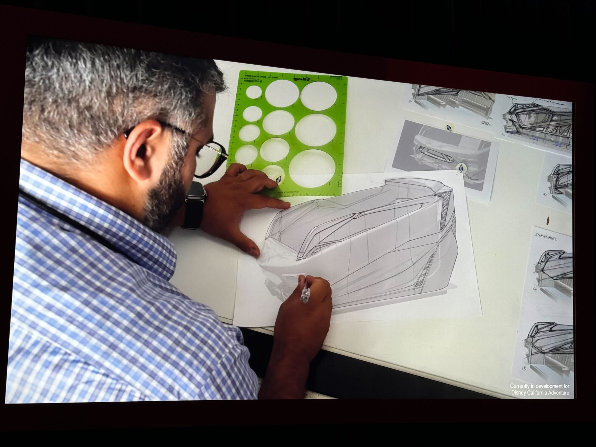 A person with glasses, wearing a checkered shirt, sketches a car design on white paper using drawing tools and templates on a desk with several car design sketches.