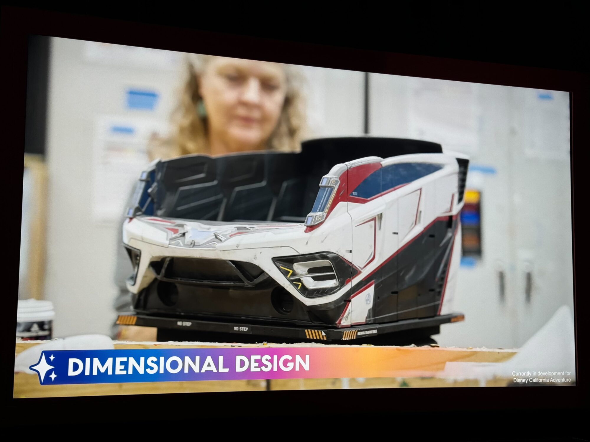 The ride vehicle is primarily white, with touches of red and black, reminiscent of the suits worn by the Avengers in “Avengers: Endgame.”