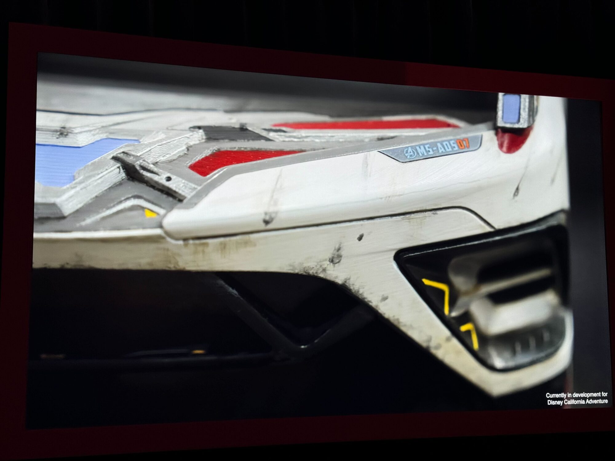 Close-up of a futuristic, white vehicle's exterior with red and blue accents, displaying the code "MS-ADS 01" and detailed texture, possibly under development for Disney California Adventure.