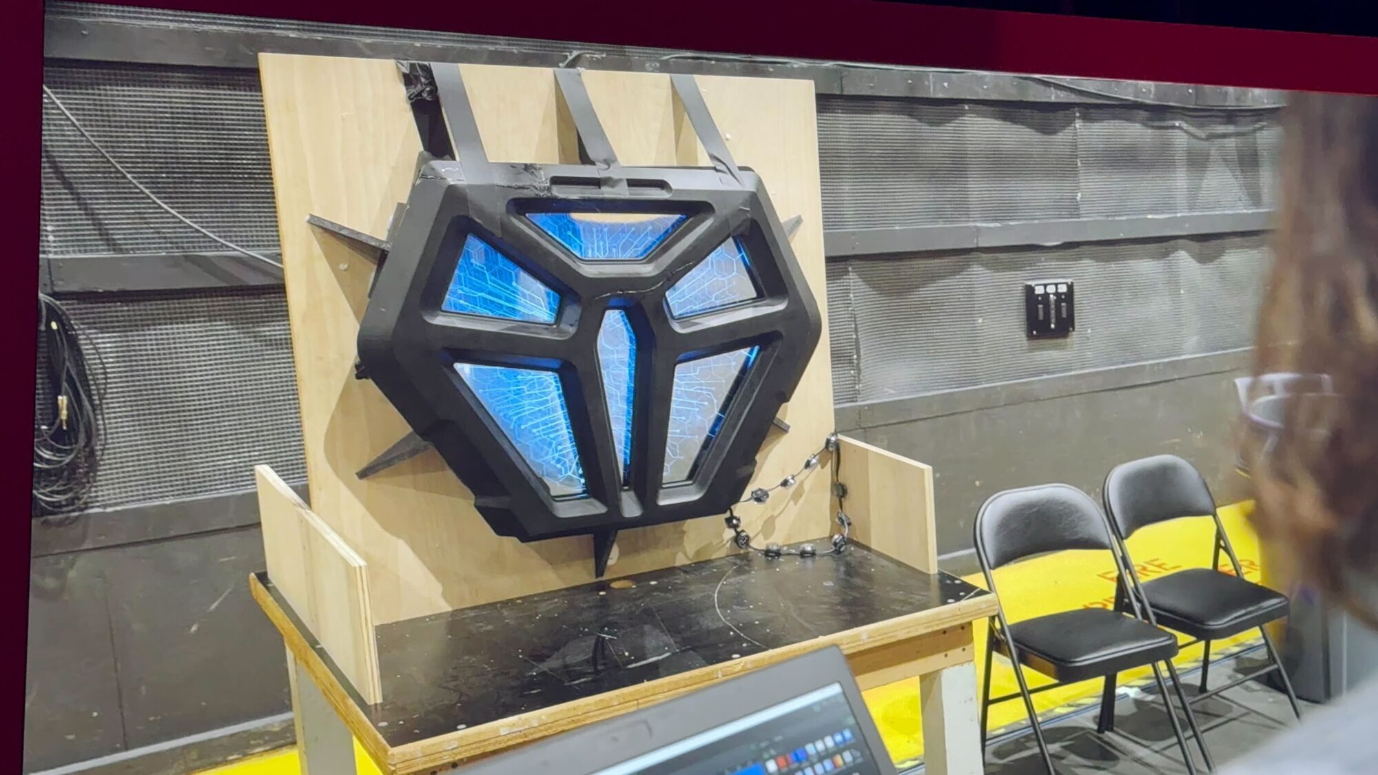 A large black and blue mechanical face-like device is mounted on a wooden board in a room. A computer monitor is in the foreground, and a chair is positioned beside the setup.