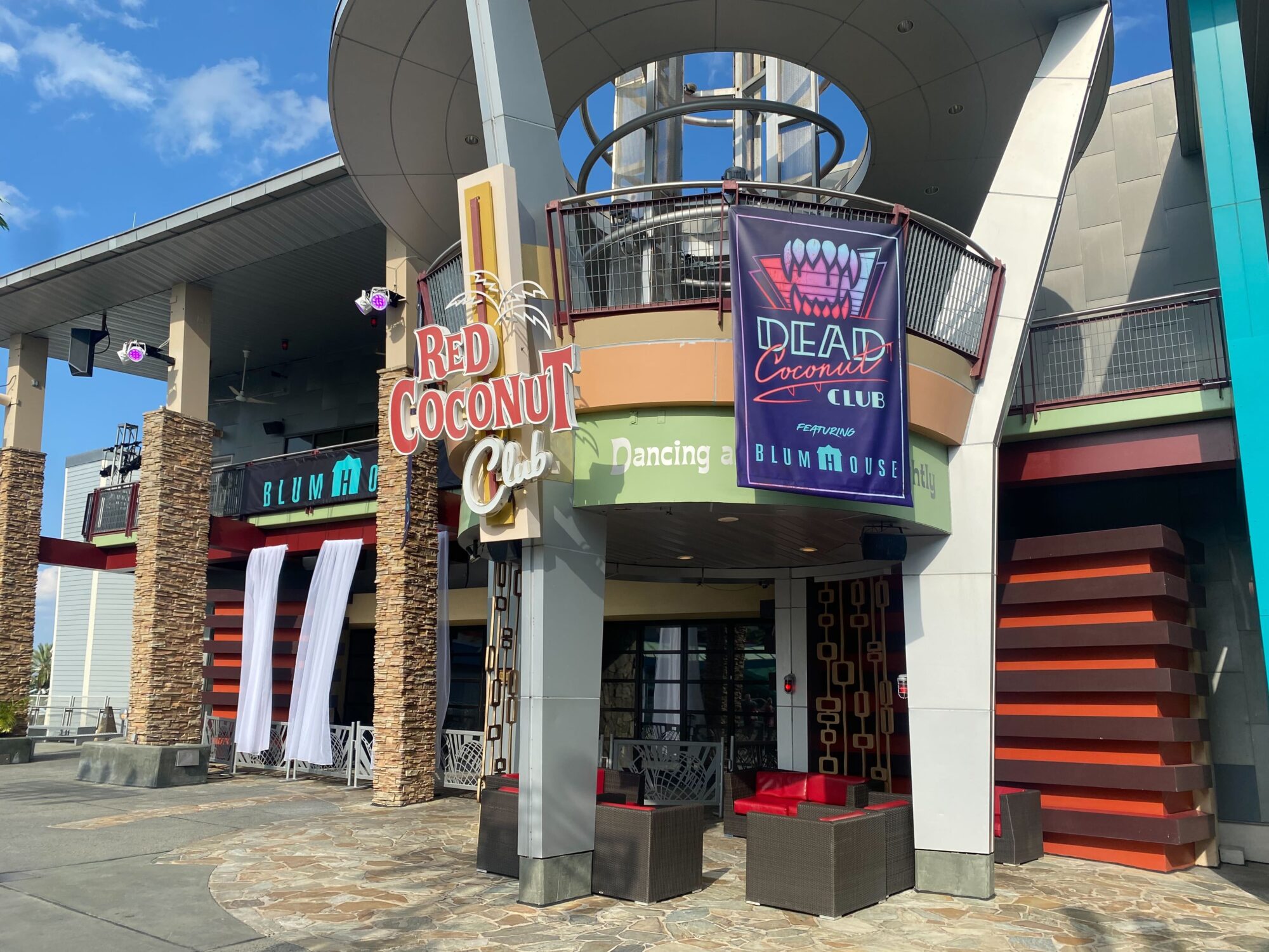 A building entrance with signage for "Red Coconut Club" and "Dead Coconut Club." The entrance features columns and a modern design with stone and metal accents. Purple and blue lights are visible above.