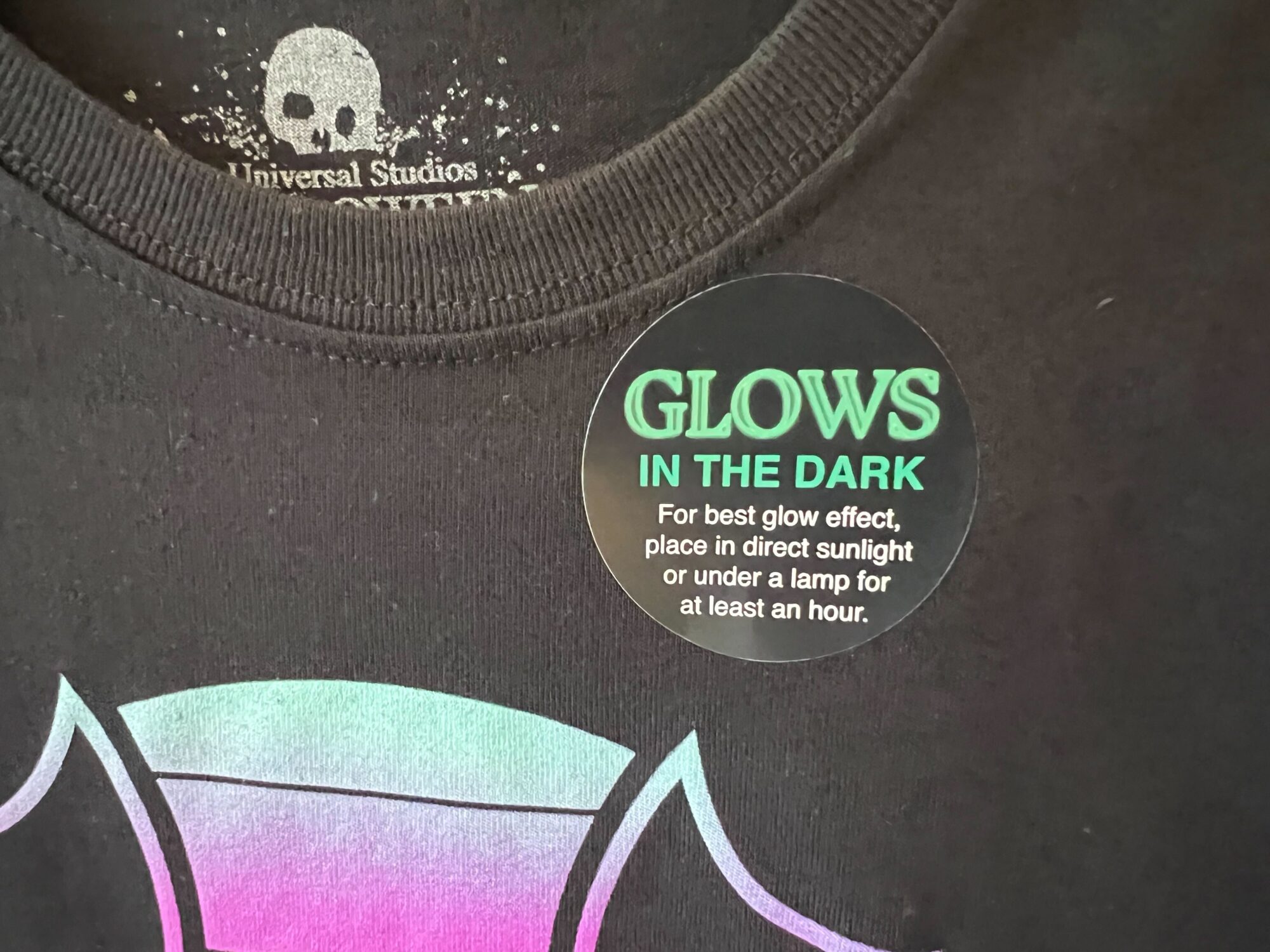A black Universal Studios shirt with a green "Glows in the Dark" sticker, perfect for your next night at the Dead Coconut Club. Instructions read: "For best glow effect, place in direct sunlight or under a lamp for at least an hour.