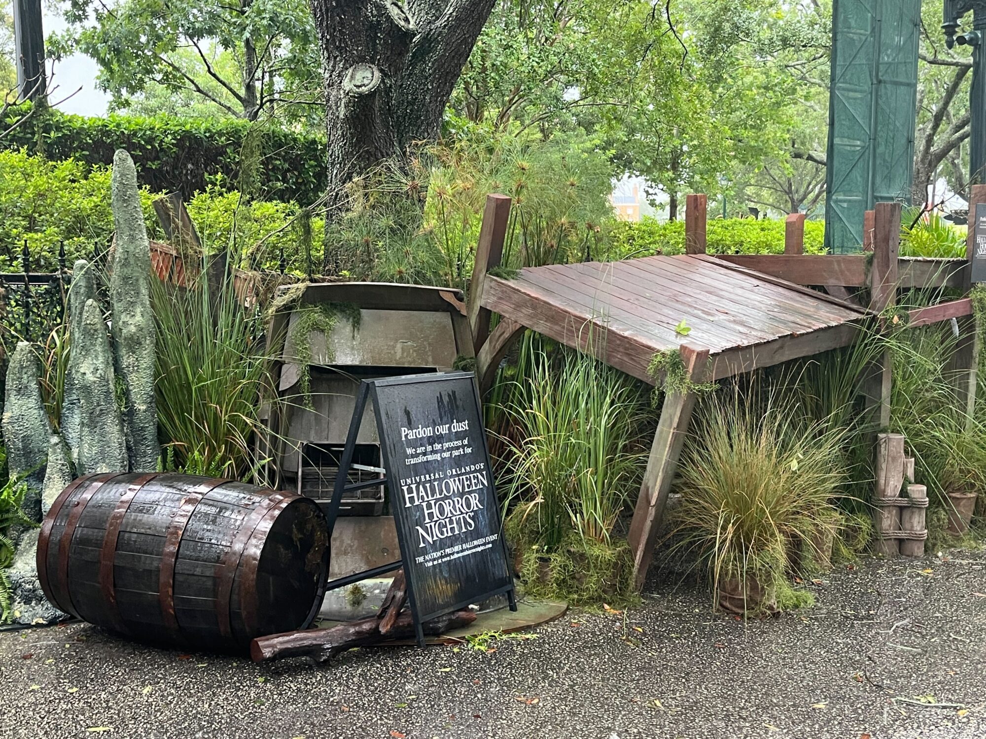 Outdoor scene showing a damaged wooden structure, a barrel, and a sign advertising Halloween Horror Nights. The area is surrounded by greenery and appears to be in a state of disrepair.