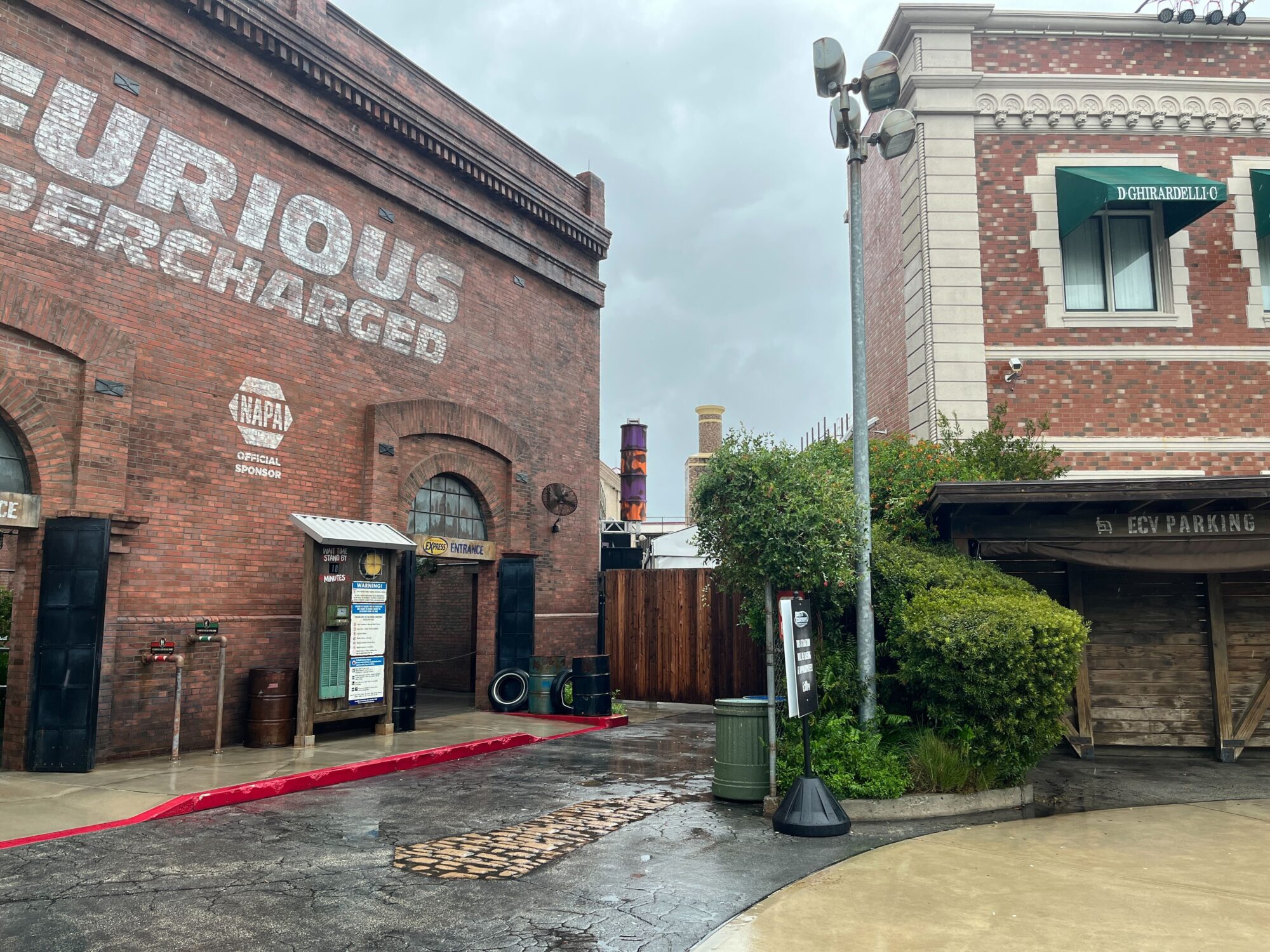 Major Sweets Candy Factory is taking shape as purple, orange, and black smokestacks have started to appear behind Fast and Furious – Supercharged.