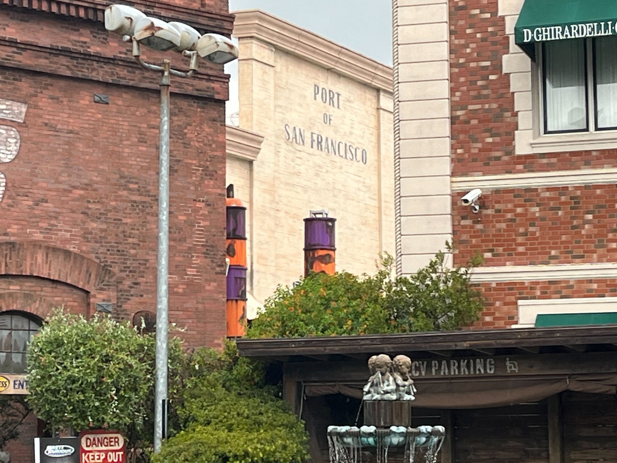 View of buildings including one labeled "Port of San Francisco," with a "Danger Keep Out" sign and greenery in the foreground.