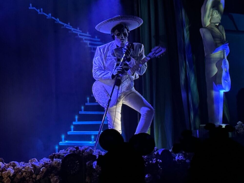 Dressed in all white with his white guitar, Ernesto de la Cruz performs for guests at the Hyperion Theater Courtyard in Hollywood Land. Ernesto has been making appearances during Oogie Bogie Bash since 2022.