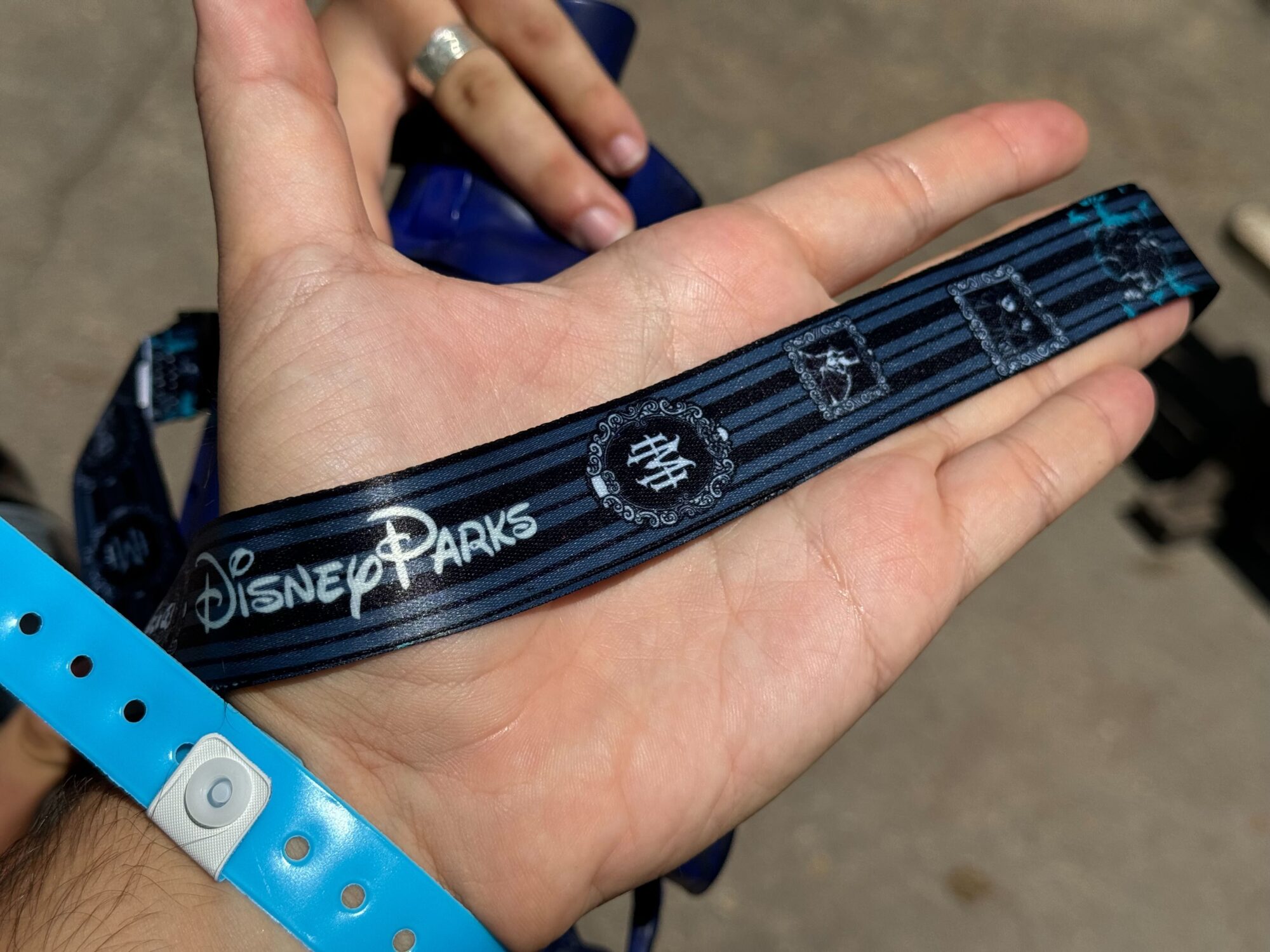 The detachable lanyard is also new. The previous design featured the iconic damask wallpaper face, bats and a bat stanchion, and spiderwebs. The new lanyard is striped with the Haunted Mansion crest emblem.