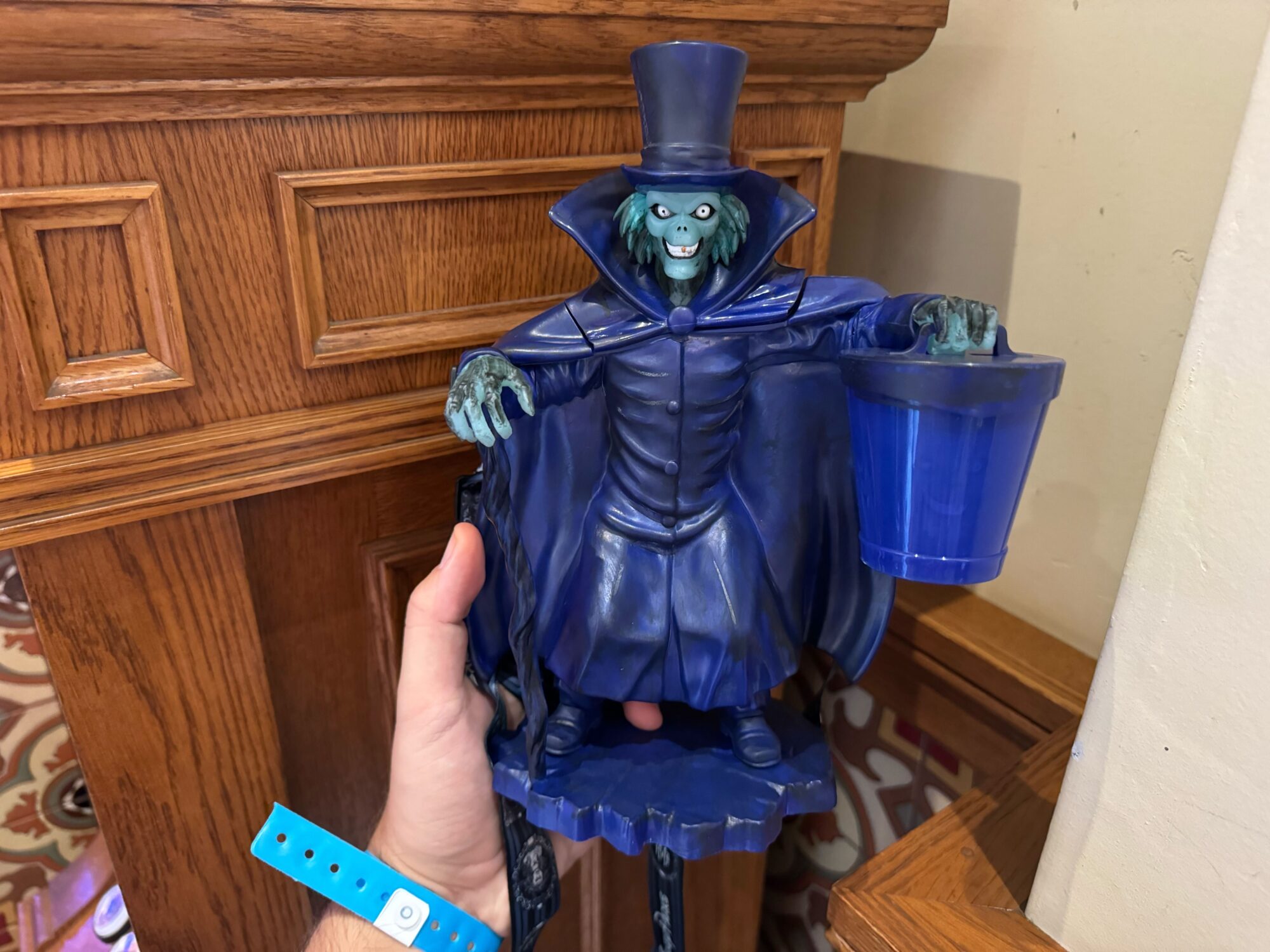 Last year’s Hatbox Ghost Sipper didn’t have any sound effects, but it did have a light-up effect, imitating the real effect on the ride. The face within the hatbox would light up while the head on his shoulders was dark and vice versa. It was priced at $32 flat and came with a bottled non-alcoholic beverage.