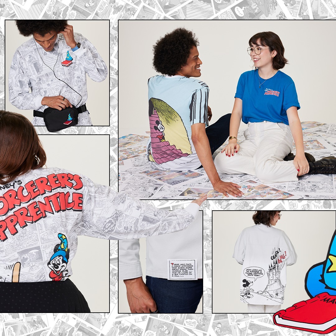A collage shows people wearing Disney-themed clothing, including a hoodie with "Sorcerer's Apprentice" printed, a white hoodie with a comic design, a blue T-shirt, and a white hoodie with Mickey Mouse.