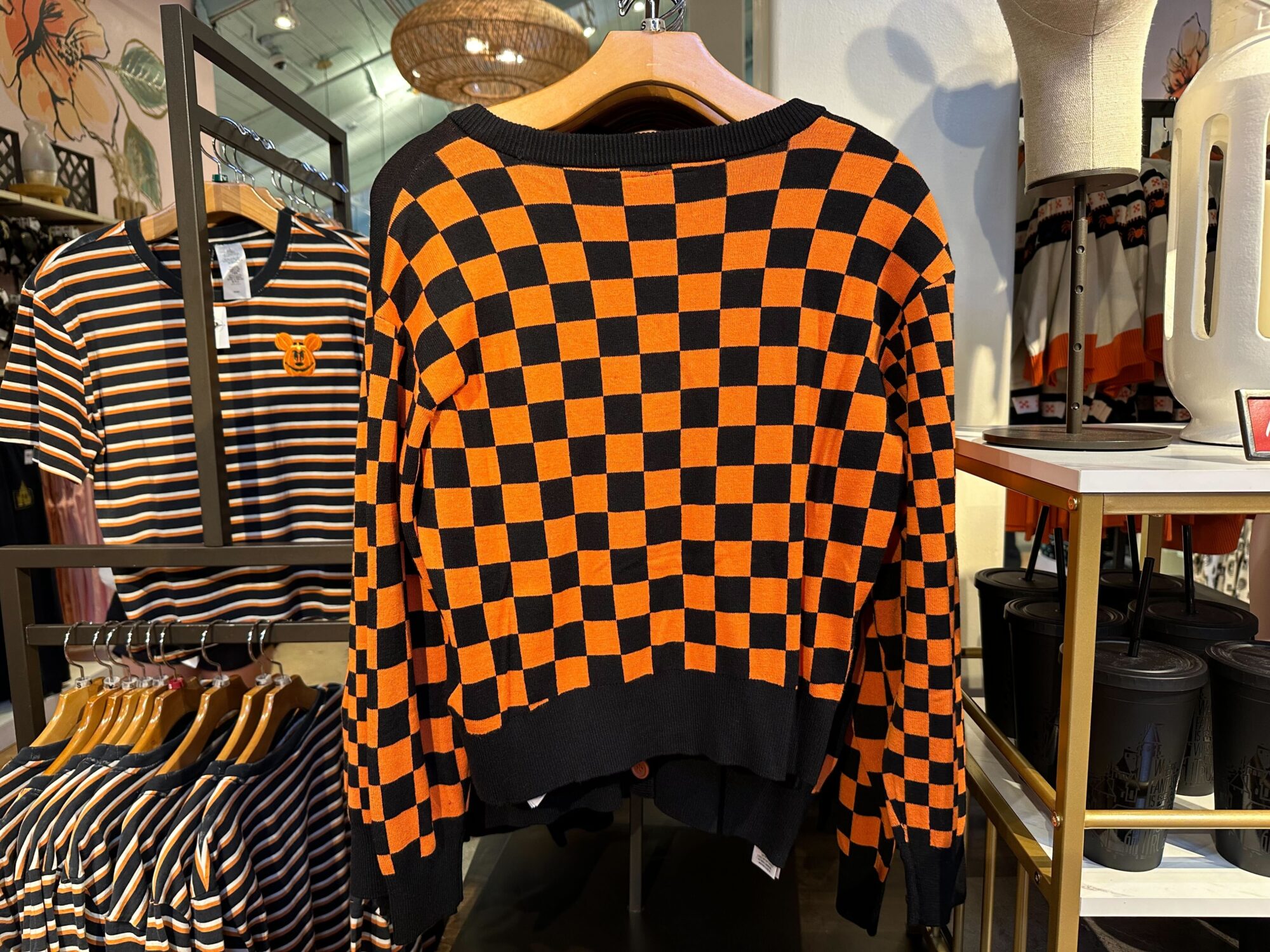 An orange and black Mickey Mouse-themed cardigan with a checkered pattern is displayed on a hanger in a clothing store.