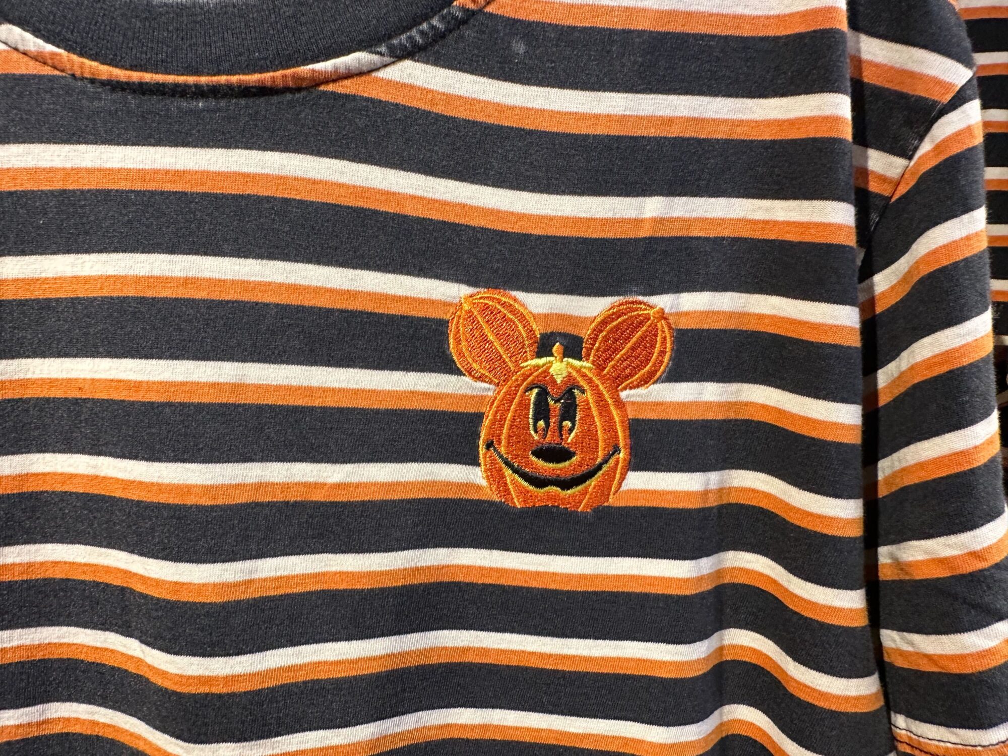 A close-up of a striped t-shirt featuring an orange and black pumpkin-themed mouse face embroidered on the chest.