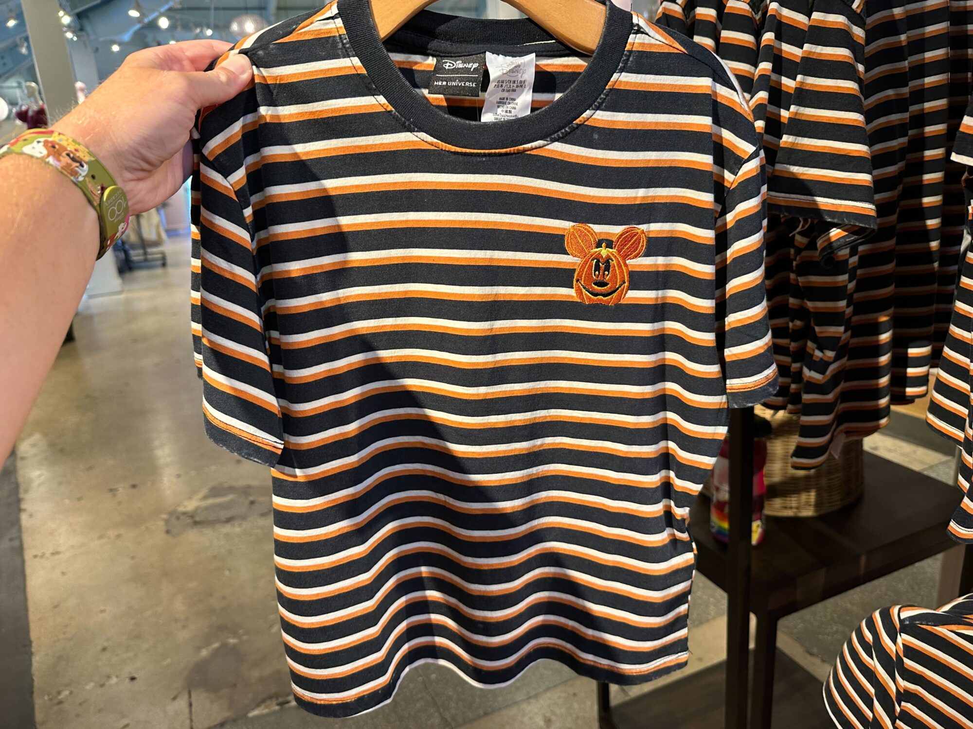 This retro-style striped Halloween tee from Her Universe features a black and orange color scheme with an embroidered Mickey Mouse jack-o’-lantern appliqué on the chest.