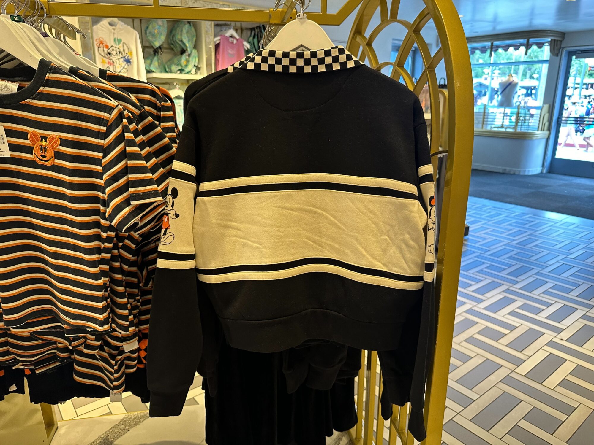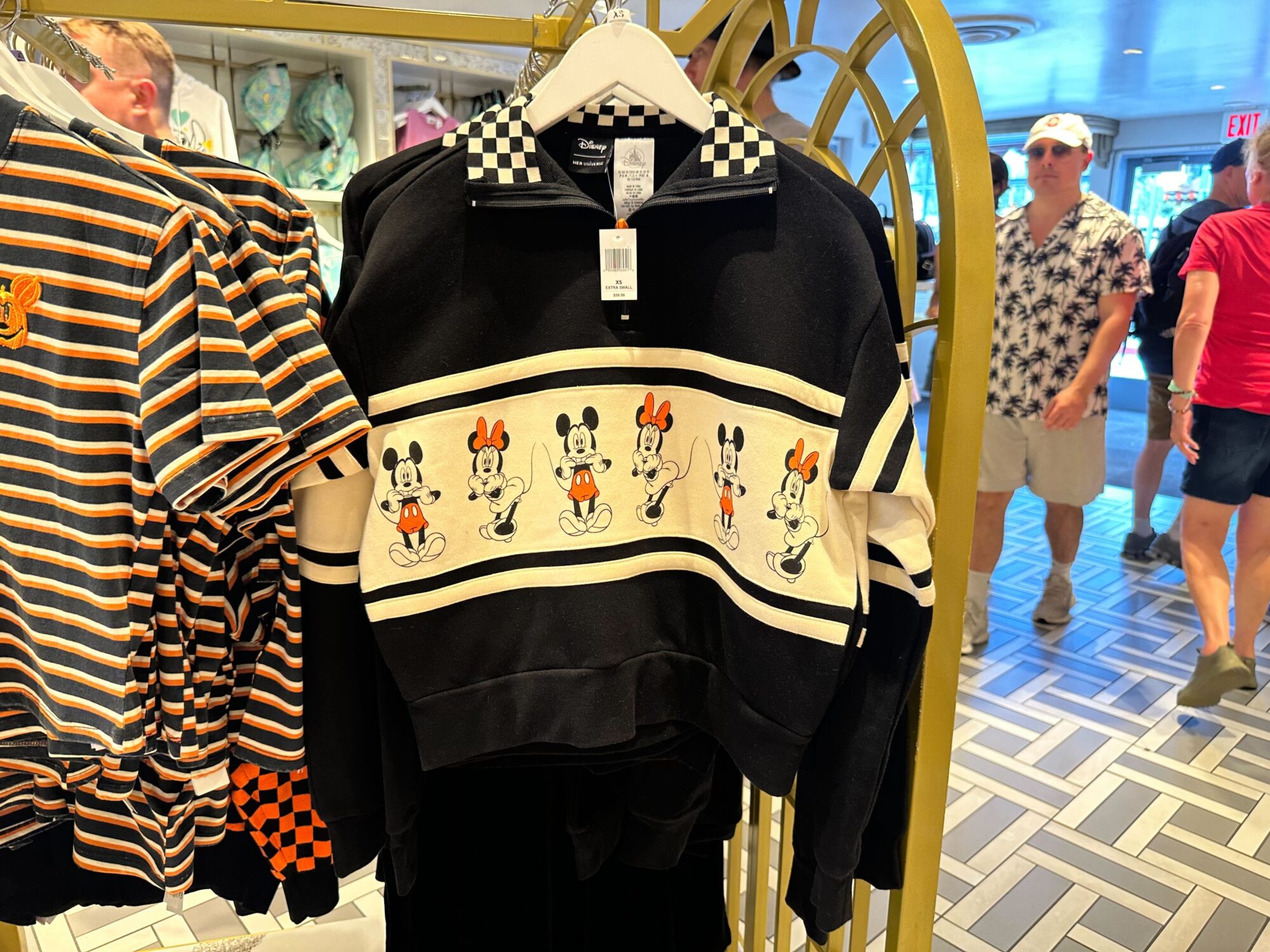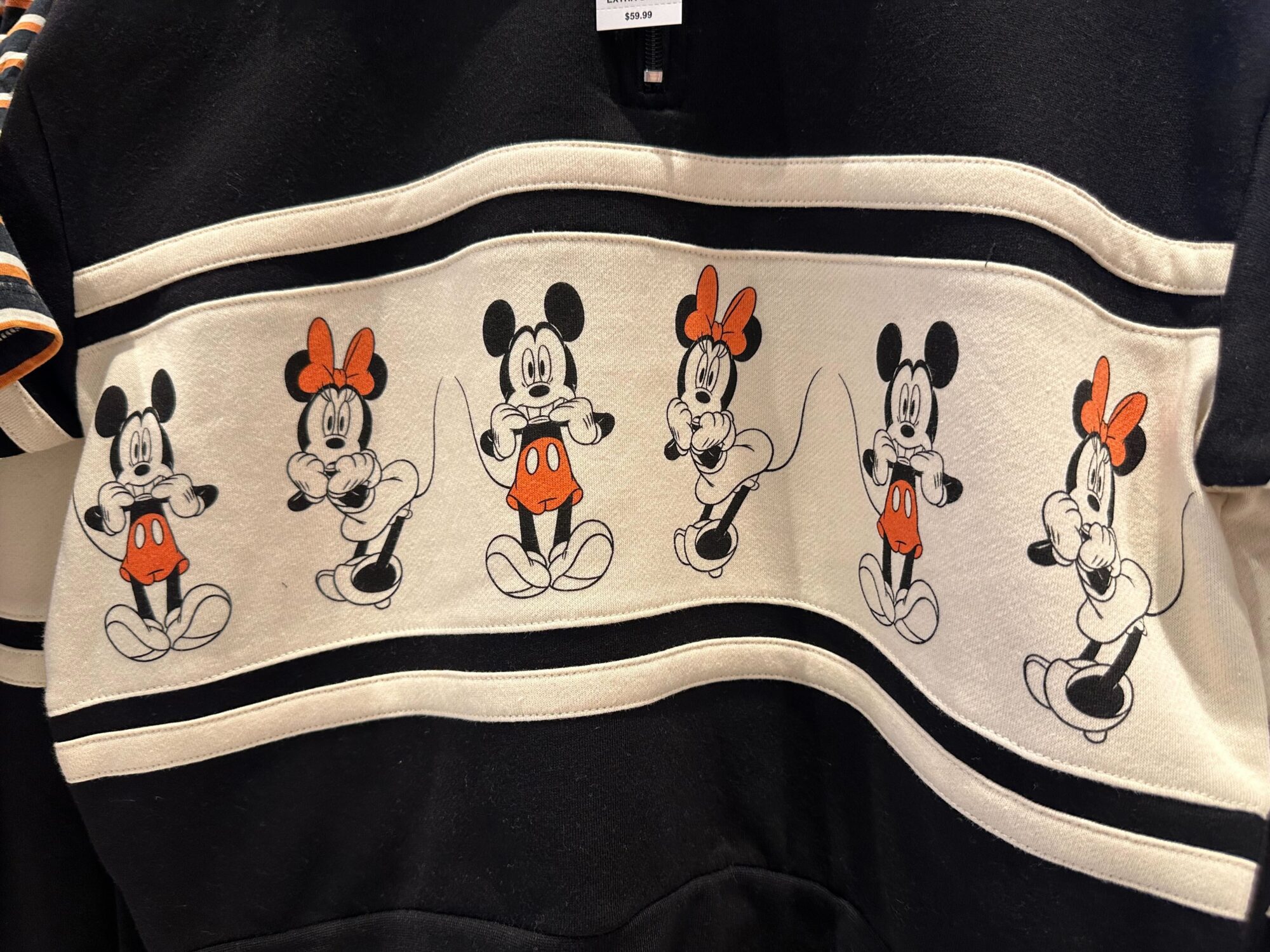 A black and white pullover with images of Mickey and Minnie Mouse in various poses is displayed on a hanger in a store.